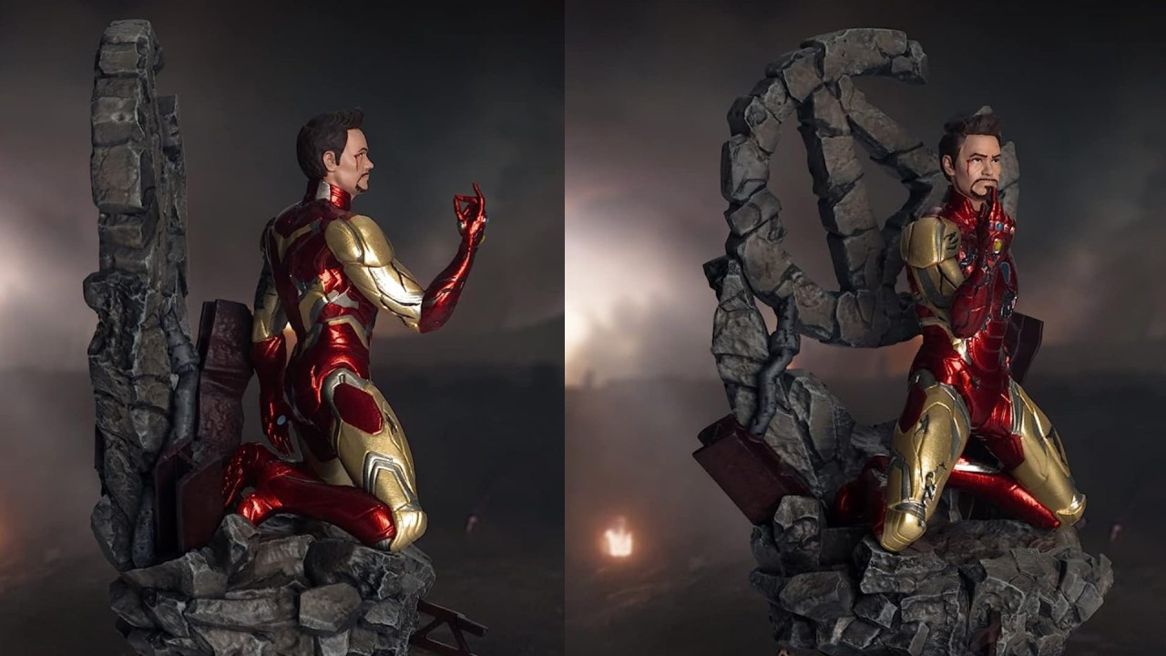 În poza de acum faimoasă, Iron-Man în costumul lui Mark-85 este văzut îngenuncheat pe pământ, gata să pocnească din degete.