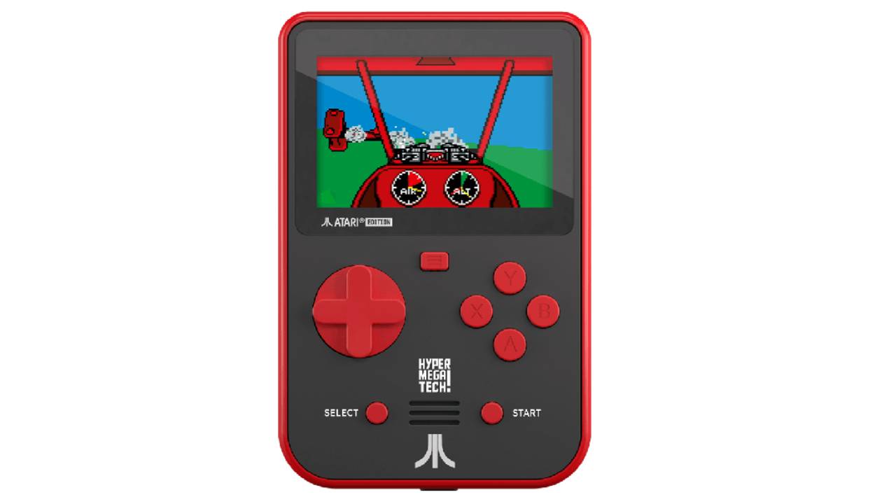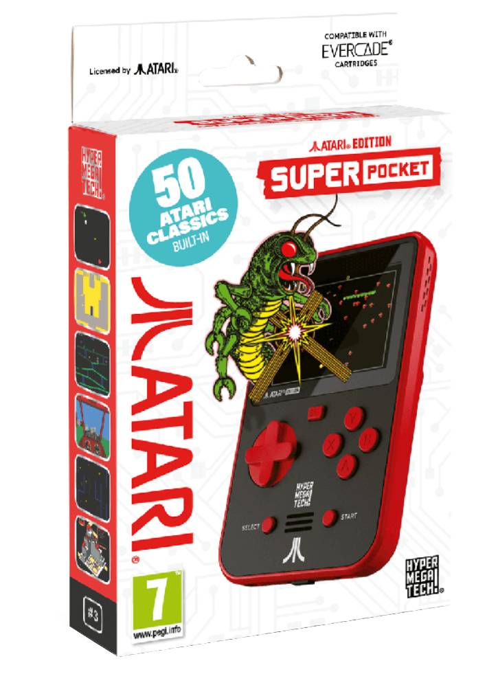 Super Pocket Atari Edition vine cu o carcasă roșie și o placă frontală neagră cu butoane roșii în stilul Atari.