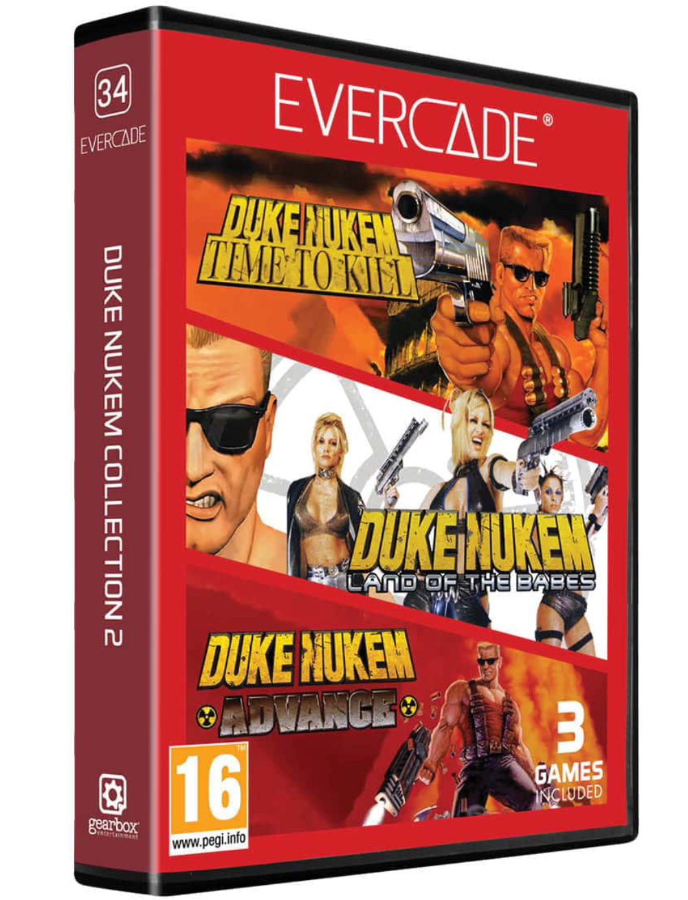 - Duke Nukem: Land of the Babes. - Duke Nukem Advance. Cele trei aventuri pe 32 de biți ale lui Duke Nukem vin la Evercade, cu haosul călătoriei în timp din Duke Nukem: Time to Kill, explozia futuristă a extratereștrilor și gorilelor din Duke Nukem: Land of the Babes și impresionanta acțiune FPS portabilă din Duke Nukem Advance.