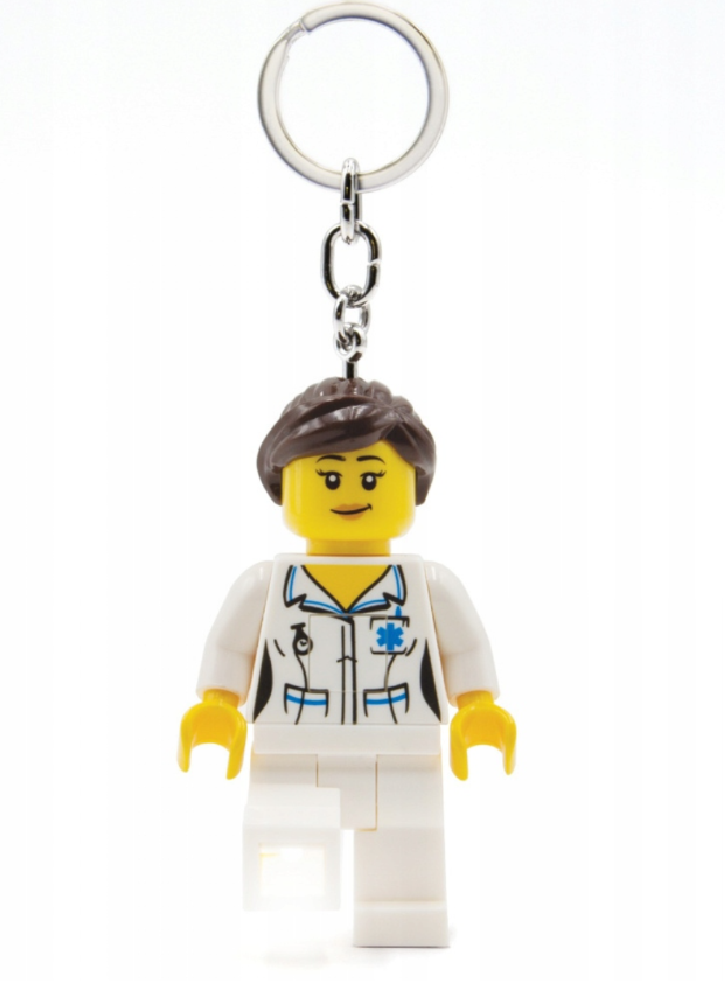 Un breloc LEGO cu o minifigurină mare LEGO Nurse, cu brațe care pot fi puse în funcțiune, o lumină LED strălucitoare în ambele picioare și un buton pe corp pentru a aprinde luminile.