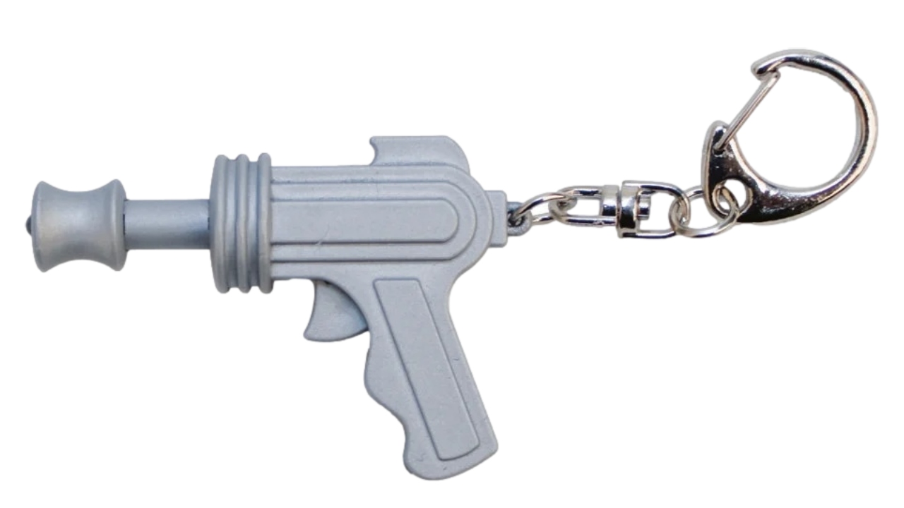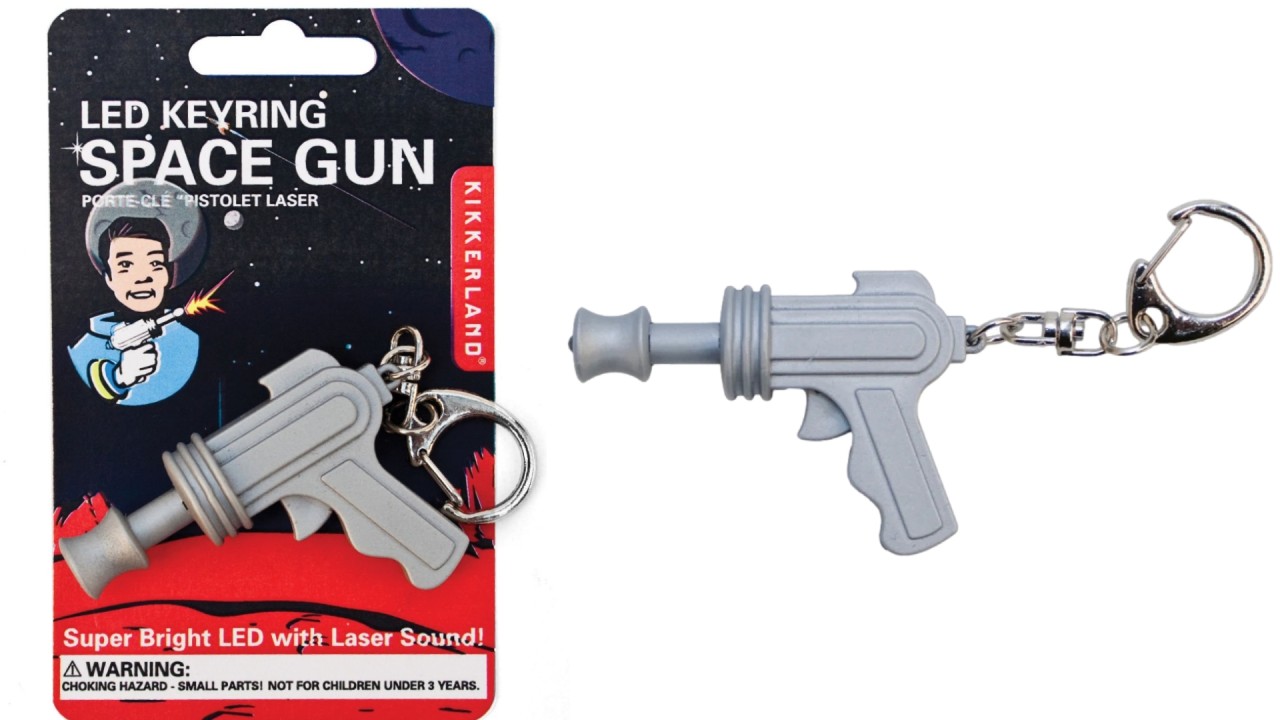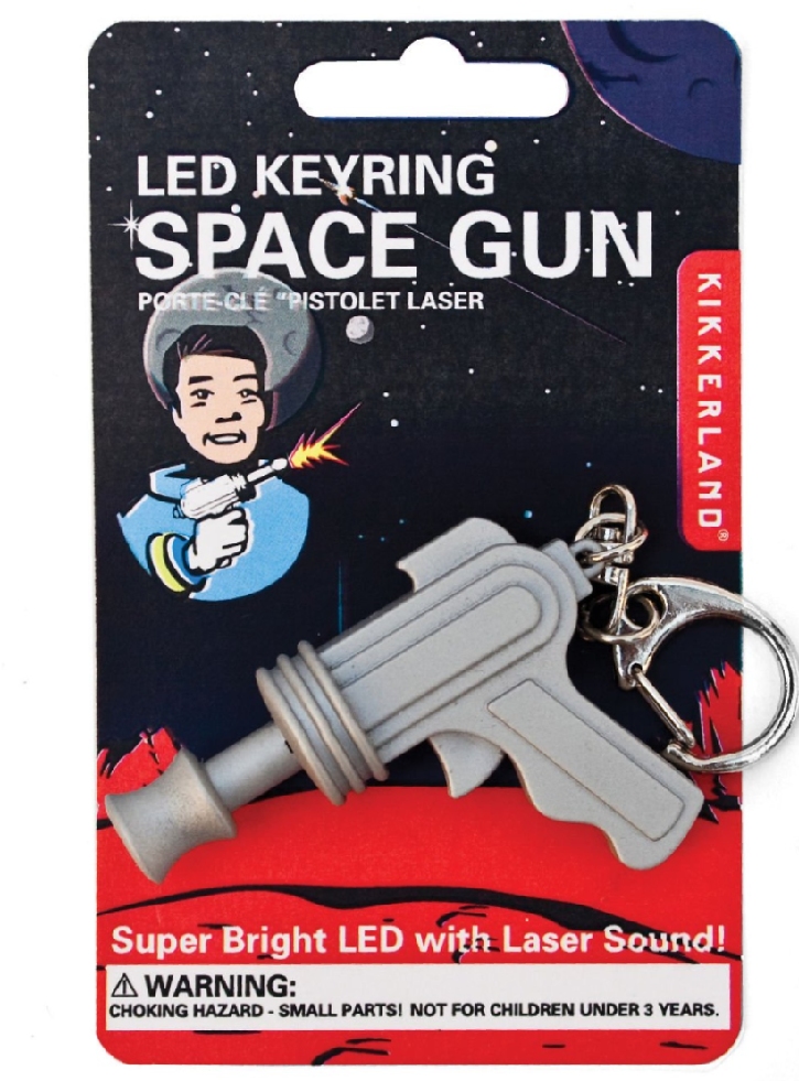 The space gun keychain emits a laser sound and flashes the LED when the button is pressed.