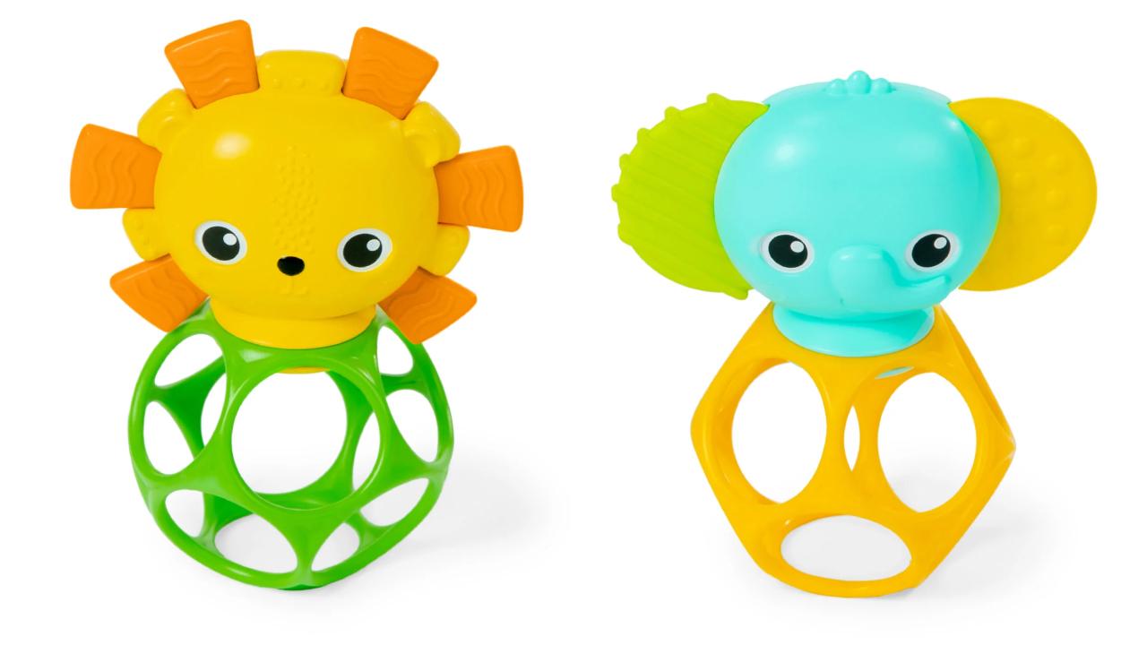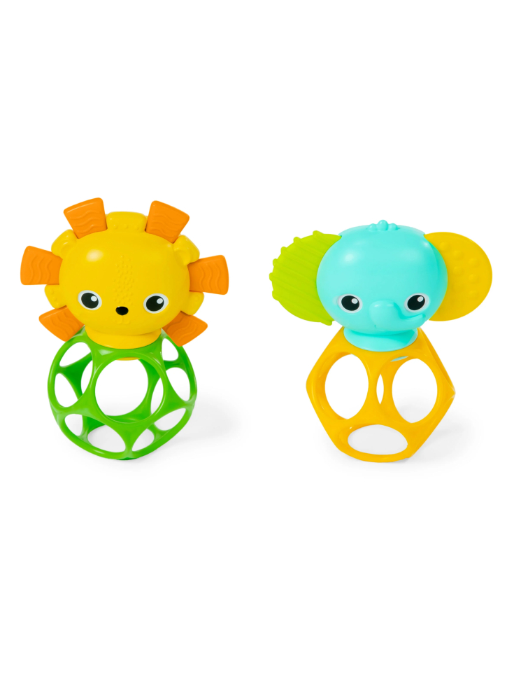 Jucărie distractivă de activitate Bright Starts vândută într-un pachet de 2 care reprezintă un dispozitiv de fixare cu un cap de elefant pe unul și un cap de leu pe celălalt.