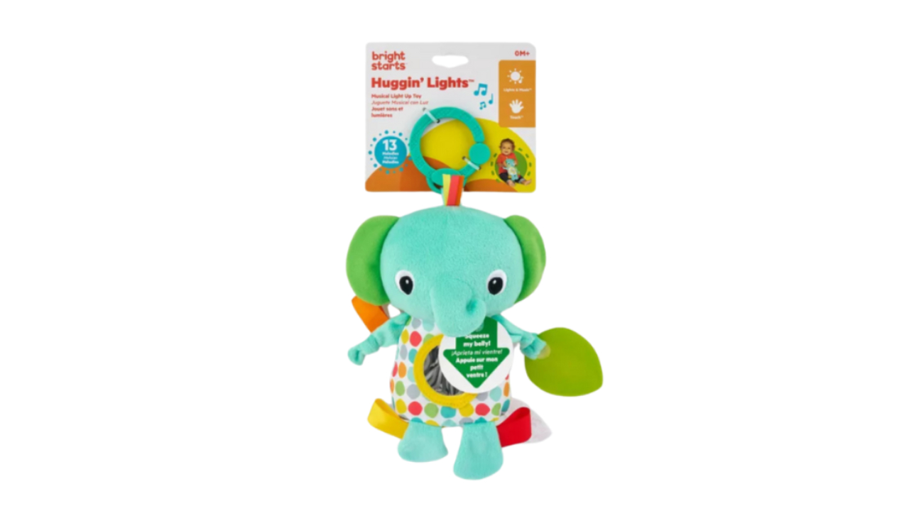 Îmbrățișările plăcute activează melodii puternice cu jucăria colorată Bright Starts Playful Pal with Lights Elephant.