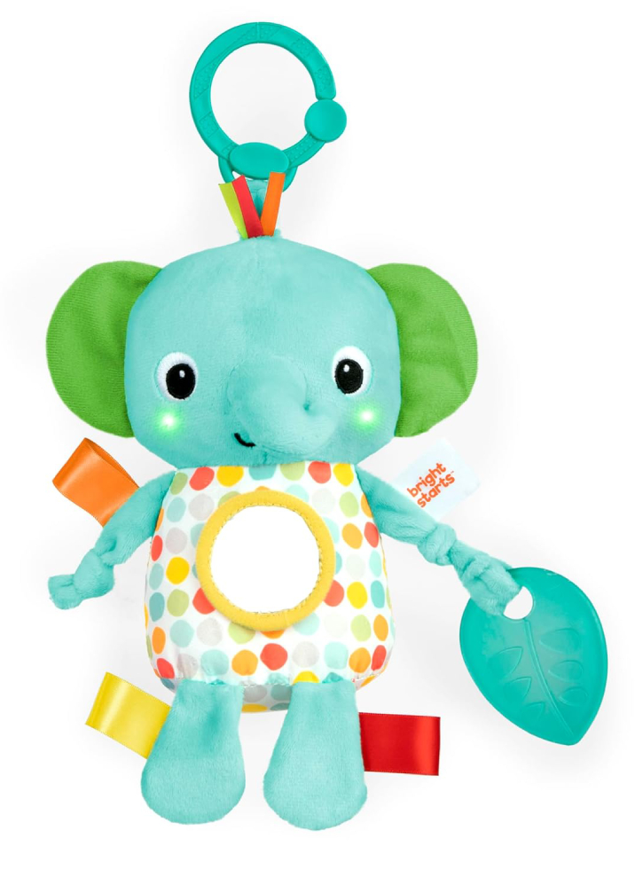 Cu materiale mixte moi și zâmbete dulci, acest prieten elefant de pluș va sta oriunde mergeți, încurajând jocul independent și explorarea tactilă. Suficient de mic pentru a încăpea în orice geantă pentru bebeluși, puteți călători cu ușurință cu această jucărie de luat cu dumneavoastră prin prinderea legăturii incluse pe orice cărucior sau cărucior.