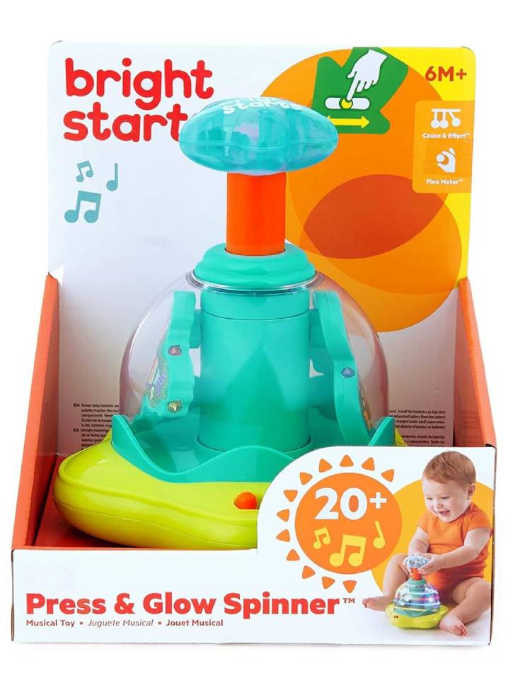 Priviți cum începe magia în timp ce lucrurile se învârt și strălucesc în interiorul rotiței Bright Starts Press and Glow Spinner.