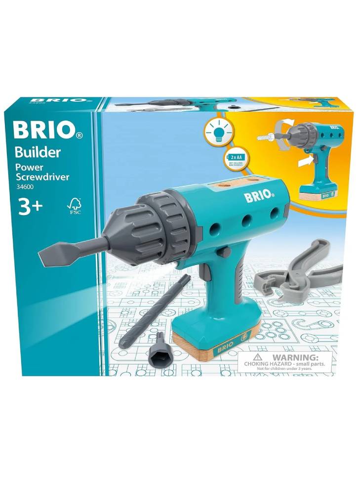The colorful, battery-powered screwdriver makes it easy to tighten and loosen BRIO Builder screws and bolts.
