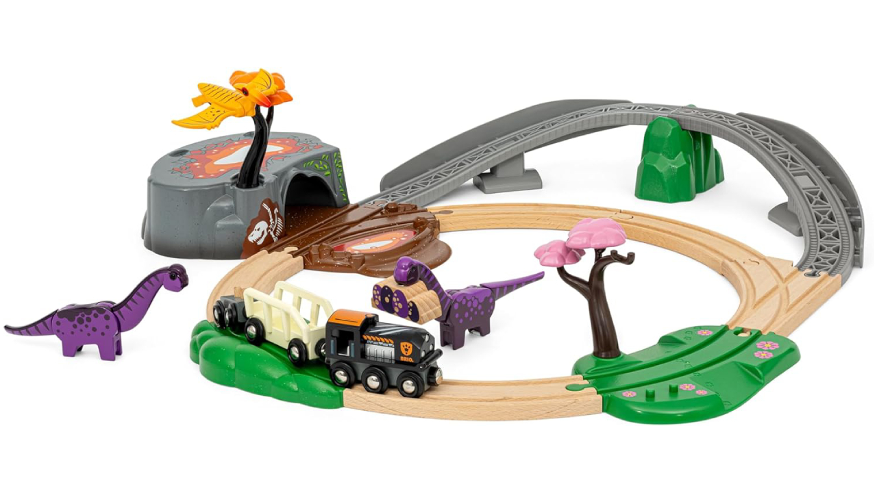 The set includes a dinosaur-themed train, two carriages and several scenery pieces, setting the stage for a thrilling dinosaur adventure.