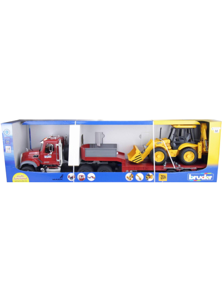 Acest set, format din modelul camionului american Mack Granit, remorcă și tractor JCB 4CX.