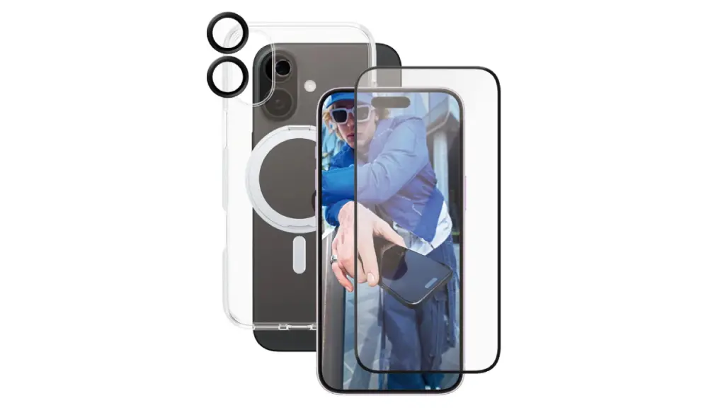 Acest pachet include o protecție ceramică pentru ecran și o protecție Ceramic Hoops pentru obiectivul camerei foto de la PanzerGlass, precum și o husă transparentă cu suport pentru picior de la CARE by PanzerGlass.