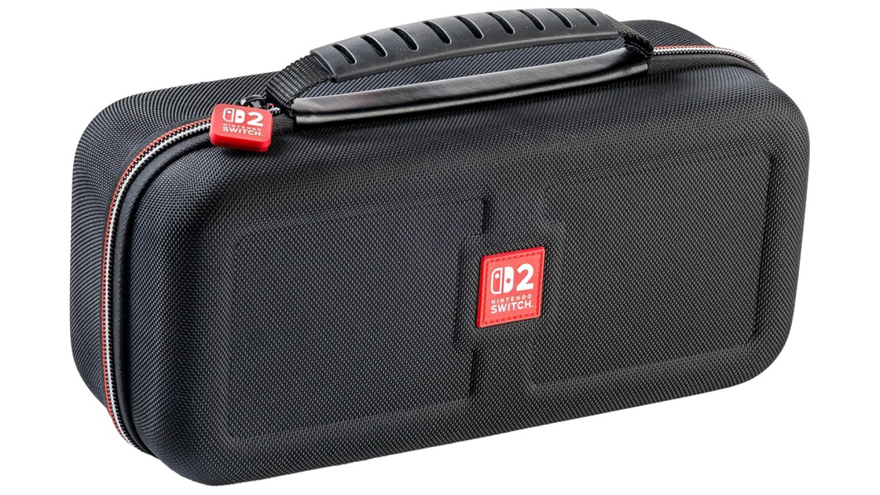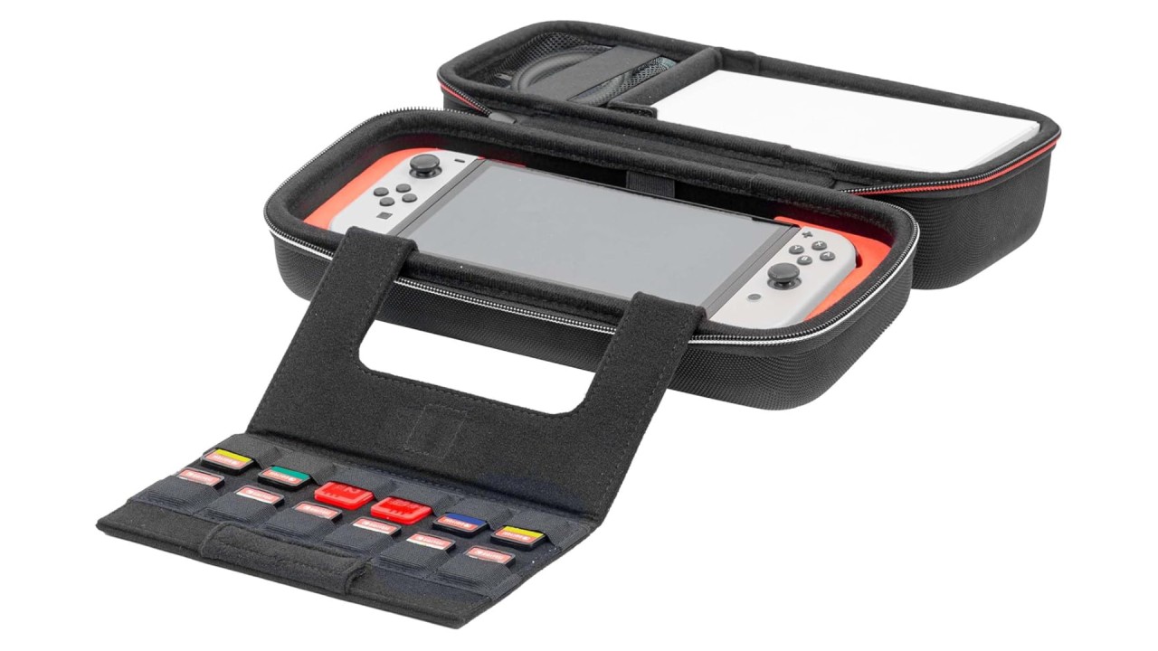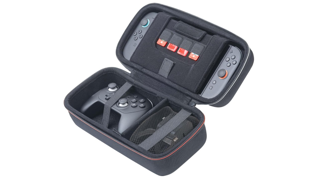 Dispune de o parte inferioară cu o curea elastică pentru a ține în siguranță Dock, Pro Controller sau Joy-Con Grip, împreună cu un separator căptușit pentru adaptorul AC și cablul HDMI.