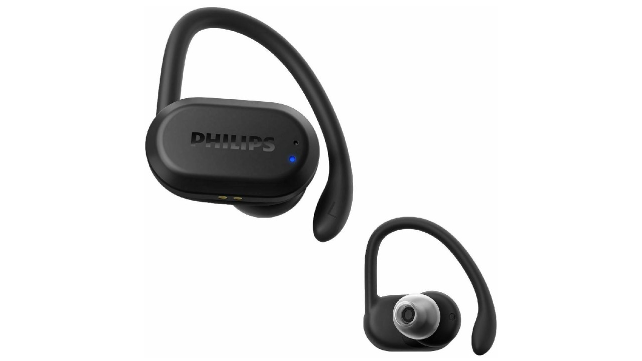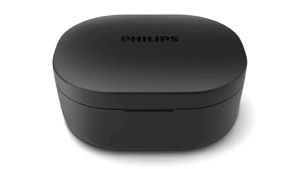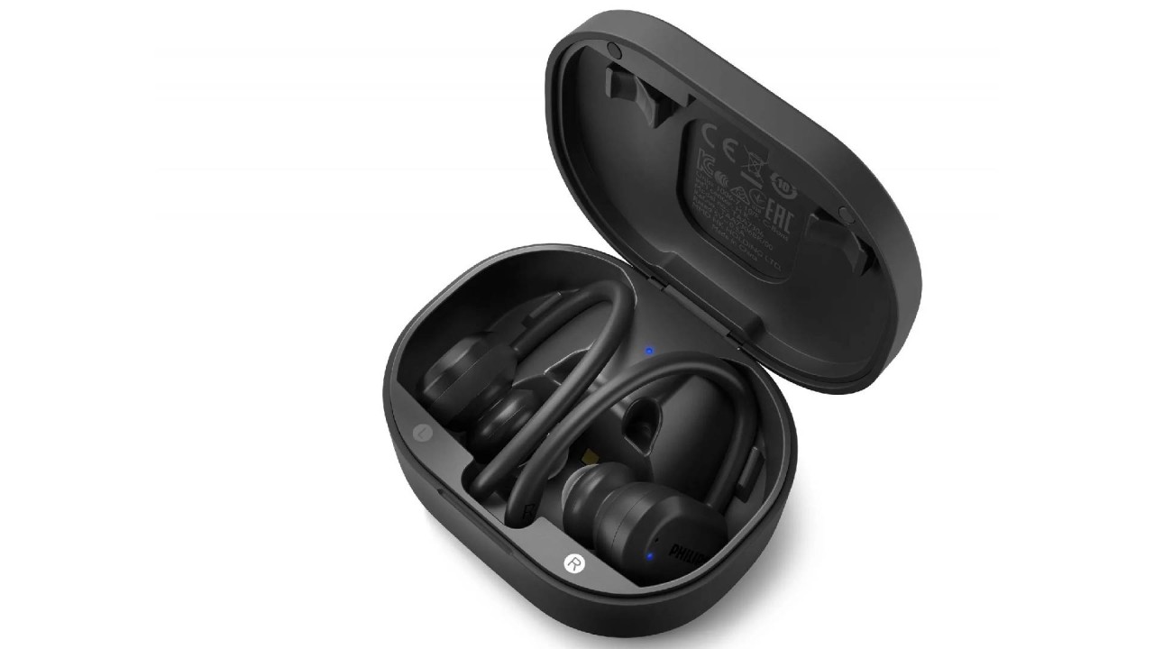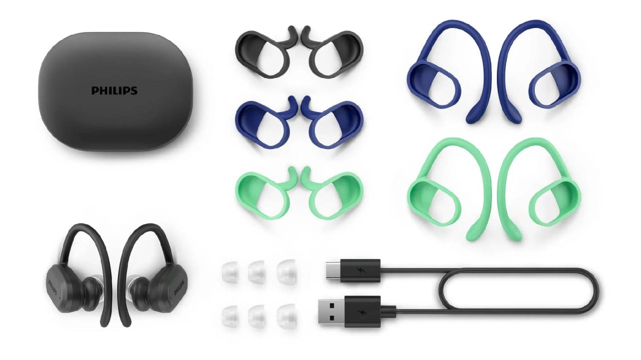 Philips headphones are included: case and carrying case, removable stand (3 pairs), removable fin supports (3 pairs), ear caps (S, M, L), quick start guide, USB-C cable.