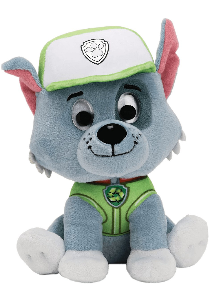 Jucăria de pluș Rocky poartă o uniformă tipică a Patrulei Puppy exact cum este prezentat in desenul animat celebru.