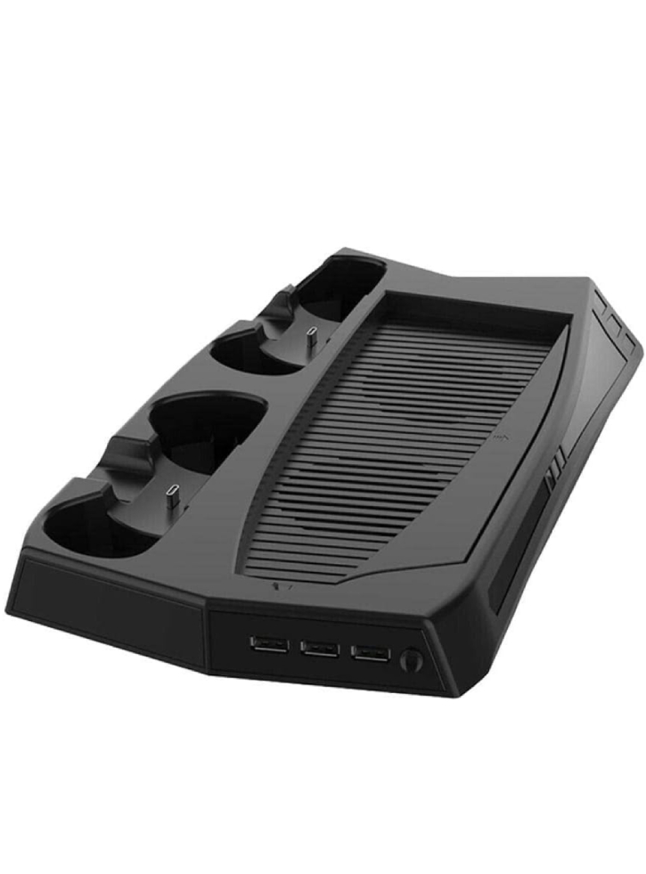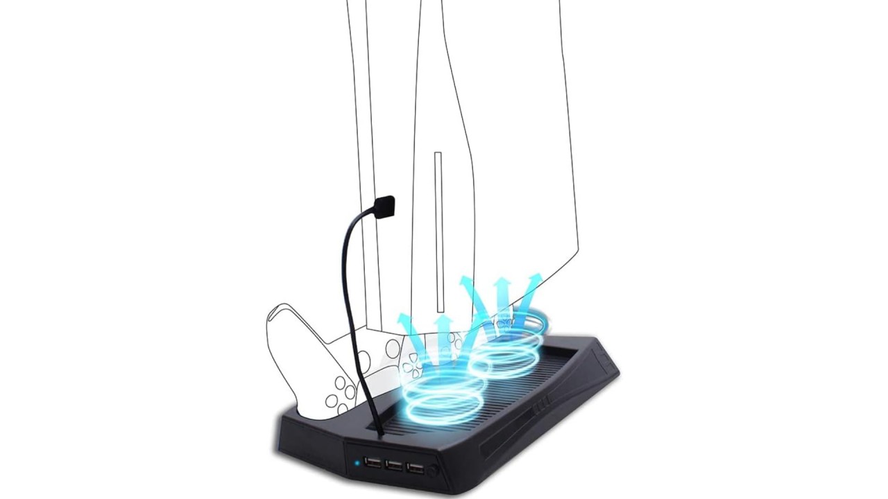Stand de încărcare + ventilator de răcire pentru PlayStation 5 este un accesoriu esențial care îmbină două funcții importante: încărcarea controlerelor DualSense și răcirea consolei PS5.