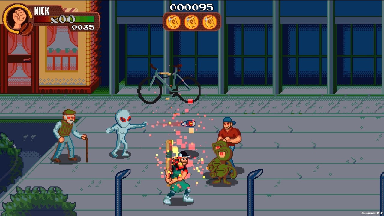 Joacă-te solo sau alătură-te unui prieten pentru a lupta în opt locații unice, de la sediul cafenelei tale până la limita spațiului cosmic. Du-te împotriva unei armate de dușmani extratereștri sălbatici și a oamenilor pe care i-au spălat pe creier cu o varietate de arme, mișcări speciale, suplexuri și cafea!