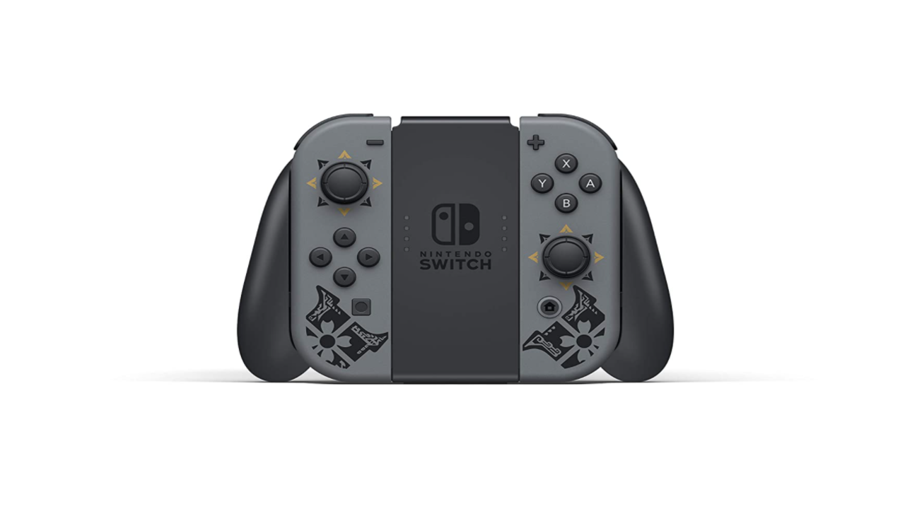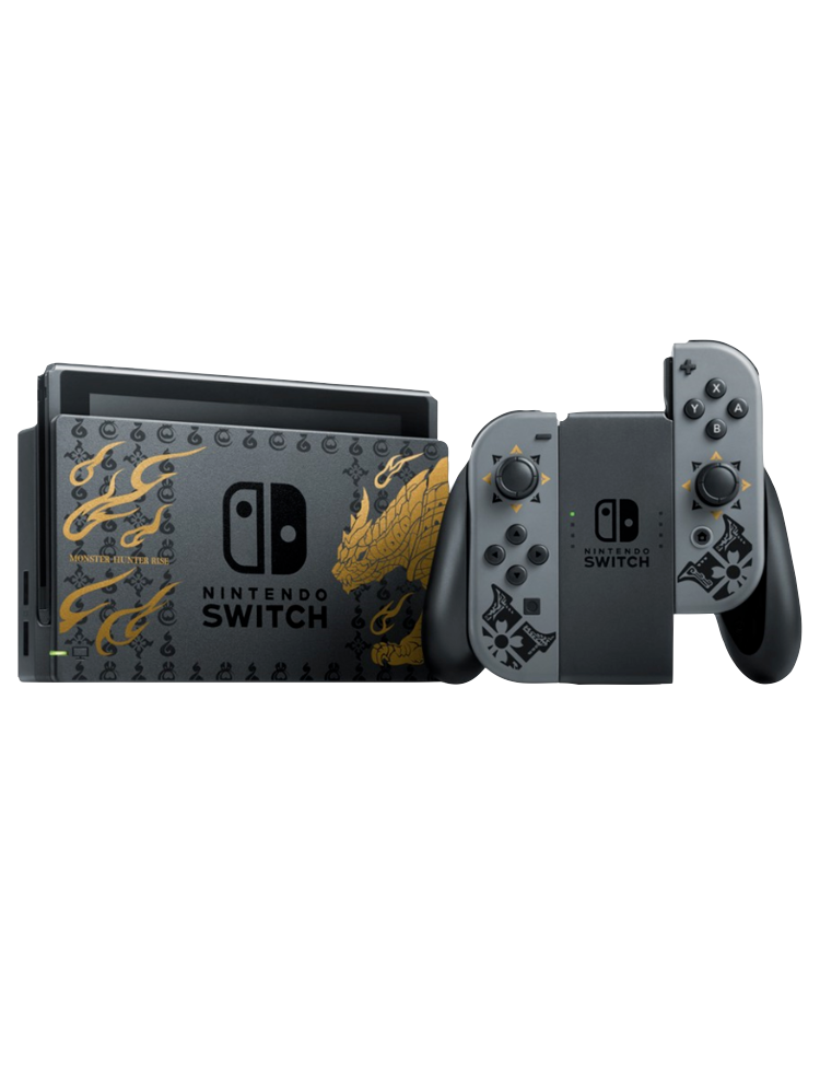 Nintendo Switch MONSTER HUNTER RISE Edition prezinta pe doc o imagine a lui Magnamalo, monstrul emblematic al jocului, alaturi de alte modele sugestive cu tematica MONSTER HUNTER RISE care impodobesc consola si ambele controlere Joy-Con.