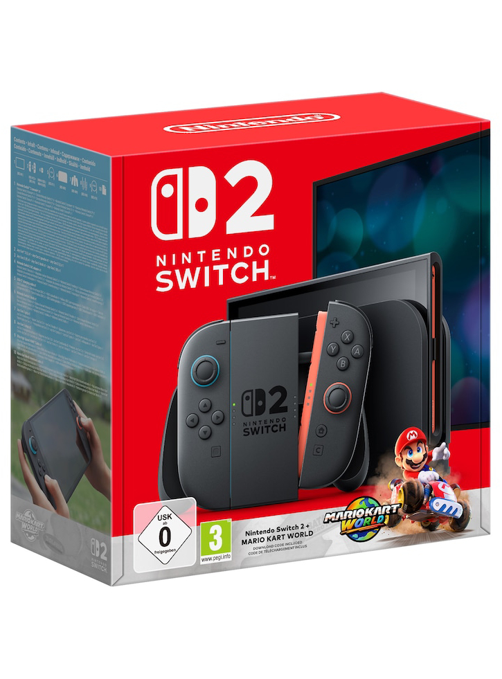 - Cablu de încărcare USB-C Începe-ți călătoria pe Nintendo Switch 2 cu pachetul Nintendo Switch 2 + Mario Kart World, care include consola și un cod de descărcare pentru Mario Kart World, disponibil din ziua lansării Nintendo Switch 2, pe 5 iunie.