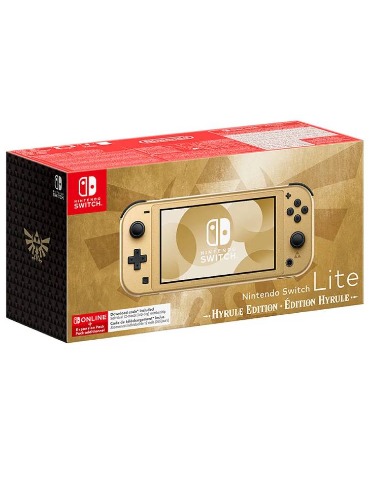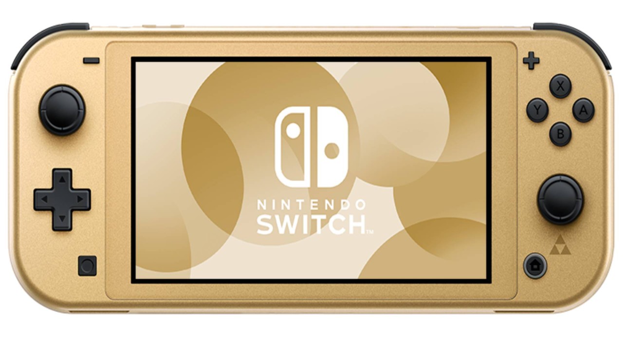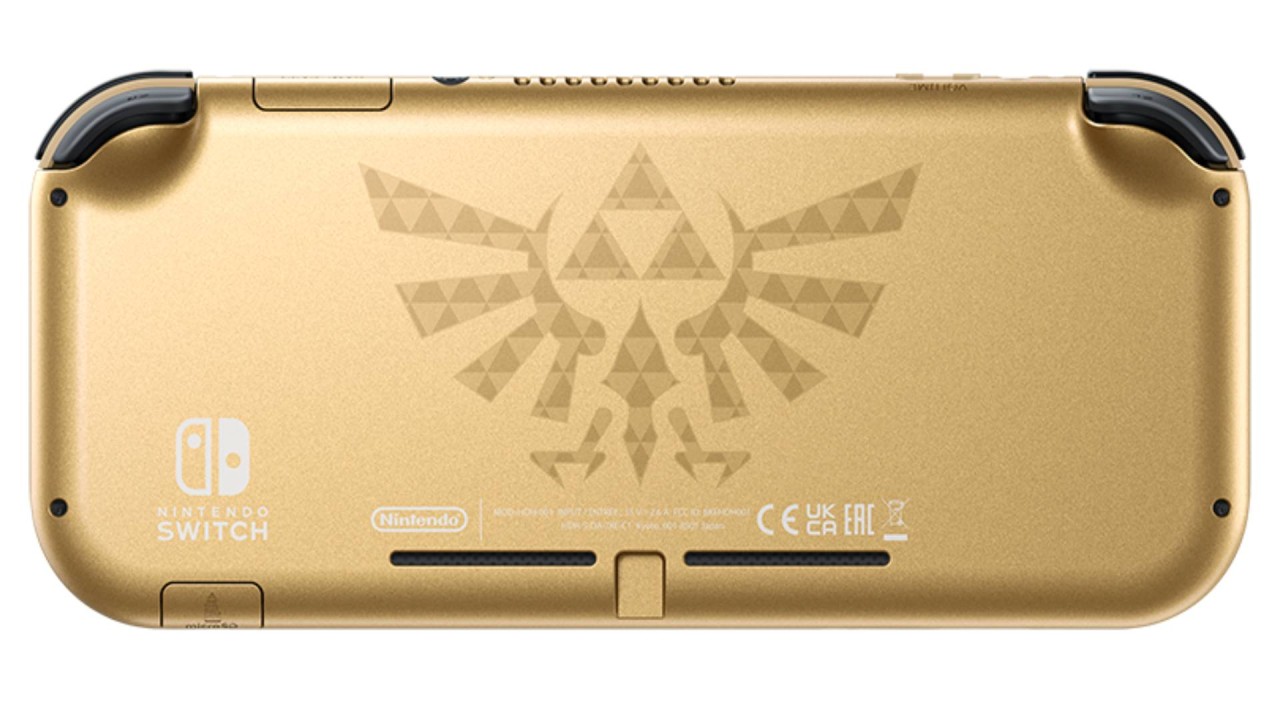This gold-colored Hyrule Nintendo Switch Lite Edition is adorned with the Hylian emblem and is inspired by The Legend of Zelda series.