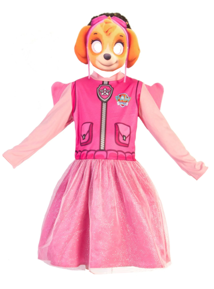 Costum Paw Patrol Skye, un set de haine roz. Pachetul include o pereche de aripi, o masca asemanatoare cainelui Skye si o fusta sclipitoare.