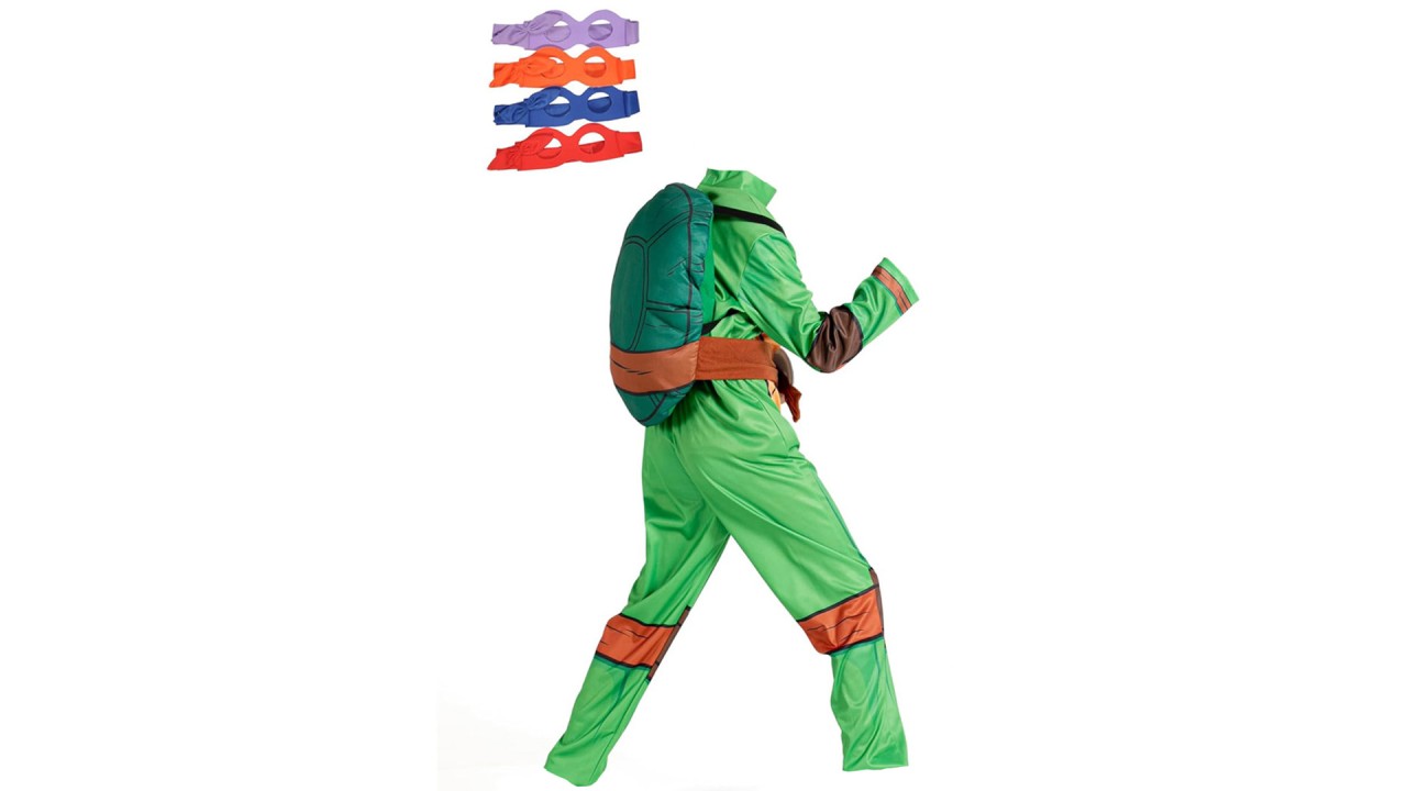 Setul constă intr-un costum complet, 4 măști diferite pentru ochi, astfel încât să poți alege ce personaj vrei să fii și un rucsac cu pernă pentru a arăta ca o adevărată Țestoasă Teenage Mutant.