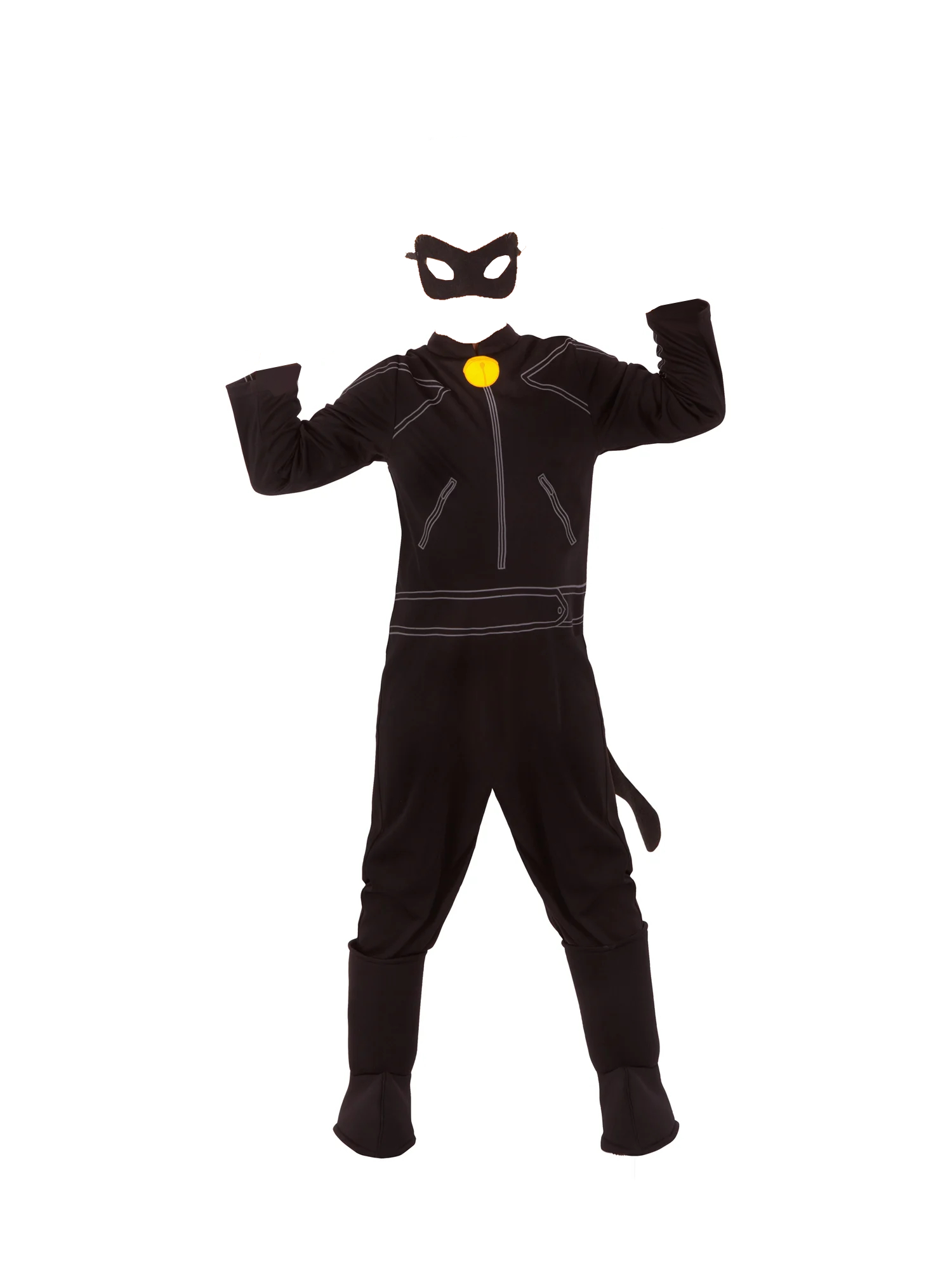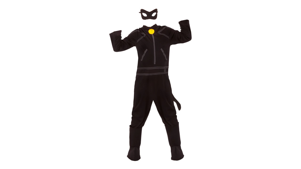 Acest costum atrăgător și plin de farmec captează esența eroică și stilată a lui Cat Noir, având un design negru sleek, completat de detalii precum centura și simbolul caracteristic pe piept.