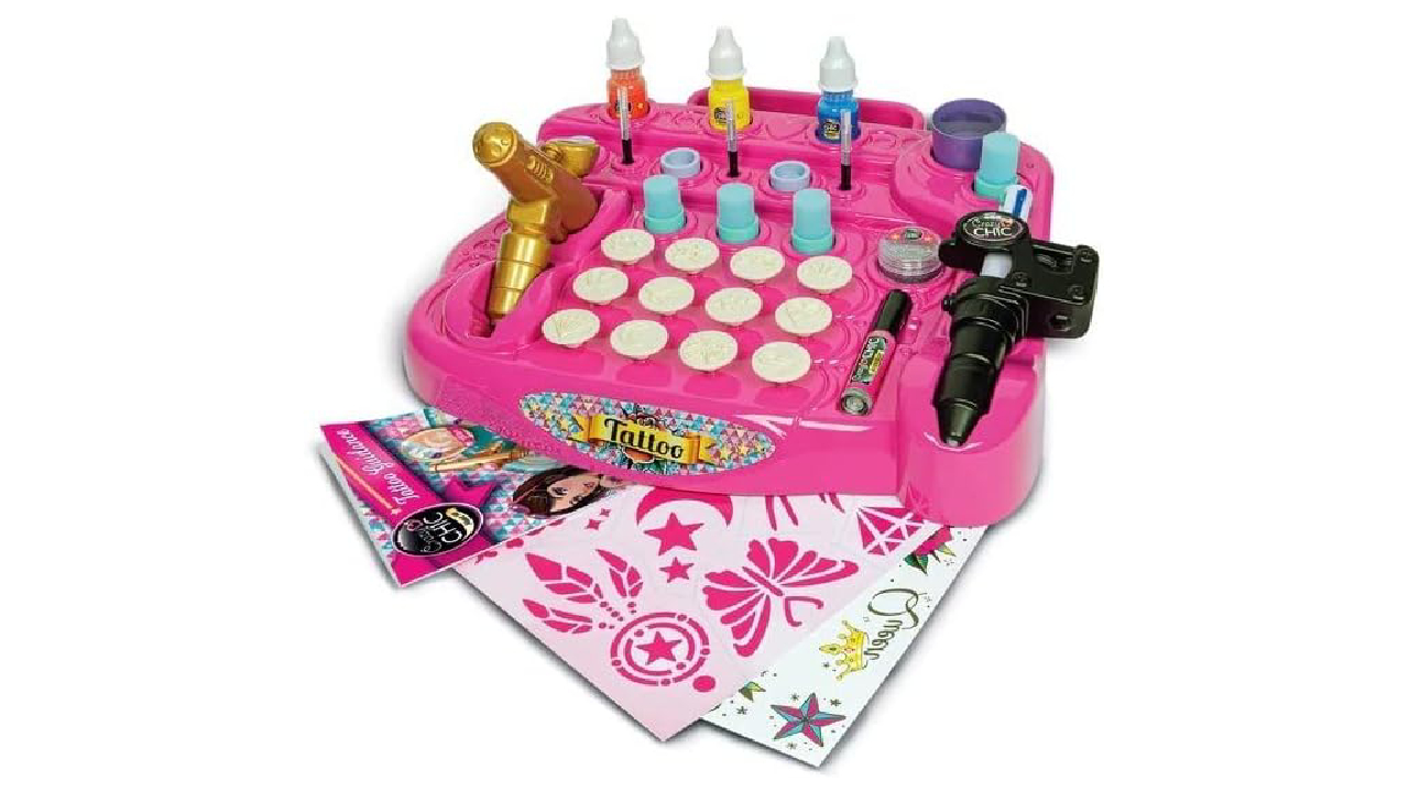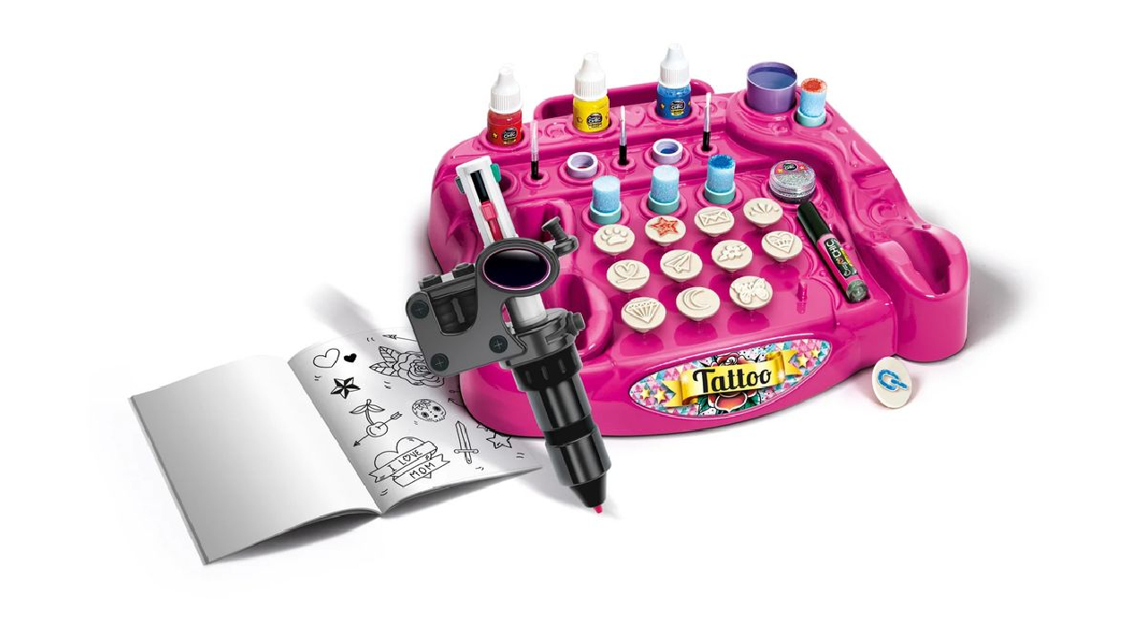 Acest studio de tatuaje temporare permite celor mici să-și creeze propriile modele de tatuaje cu ajutorul unei varietăți de șabloane, cerneluri și accesorii strălucitoare.