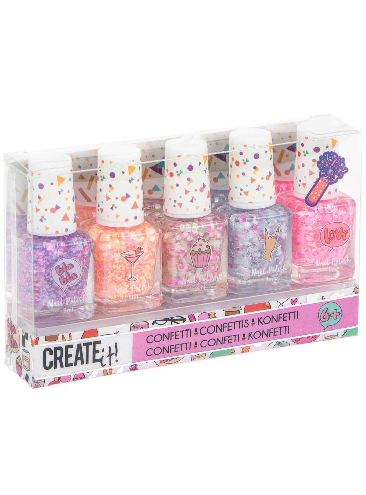 Cinci sticlute de lac de unghii! Expoziția Create It! Setul de lacuri de unghii Confetti nu arată minunat doar pe unghii, ci și în sticlute!
