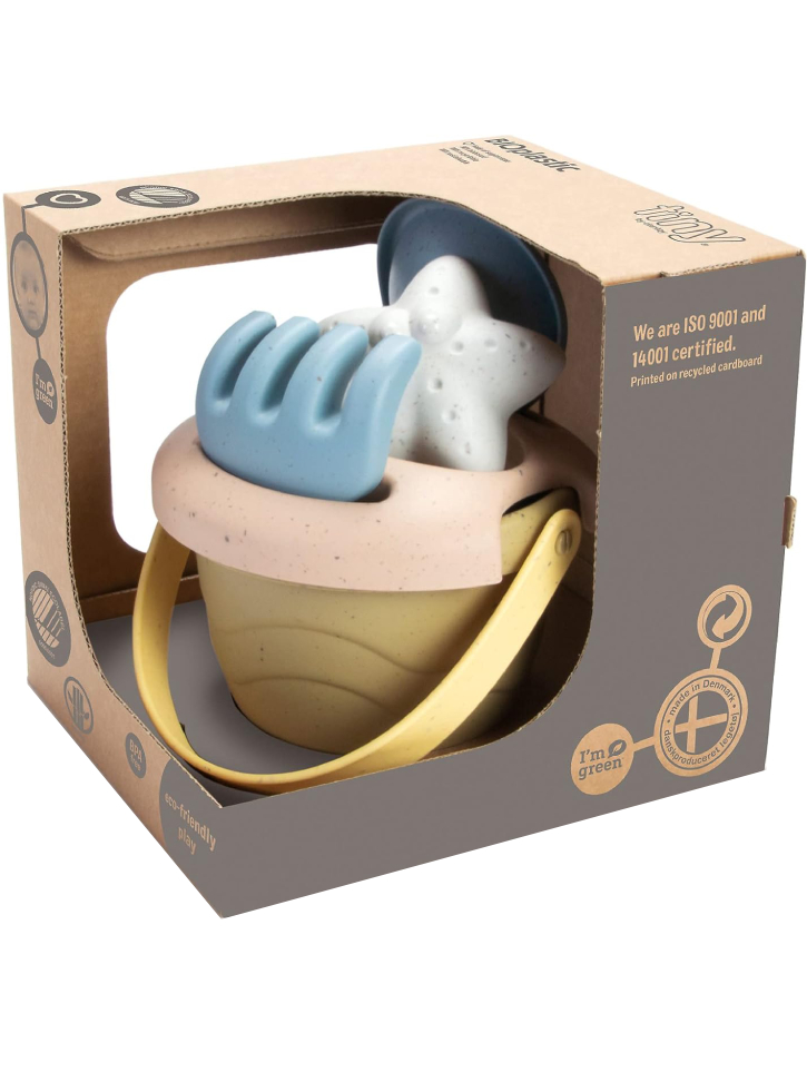 Micuțul set de găleți BIO este fabricat în Danemarca din bioplastic, care este o materie primă sustenabilă obținută din trestie de zahăr, ceea ce face ca setul să fie certificat pentru a purta eticheta ecologică Nordic Swan Ecolabel.