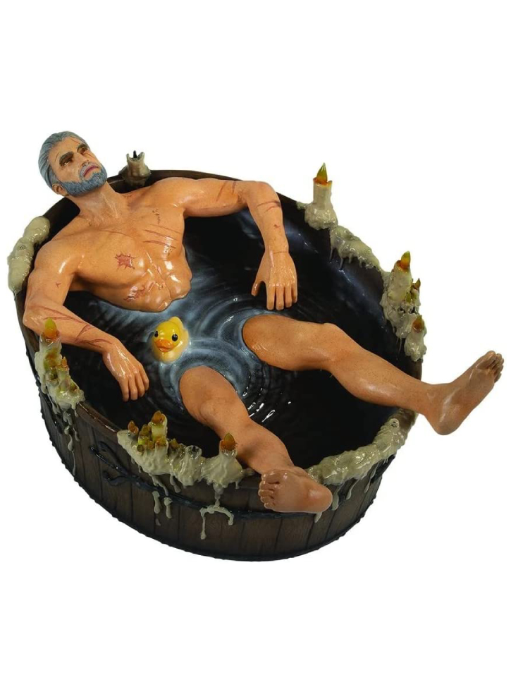 Statuetă minunat de detaliată, pictată manual, care îl înfățișează pe Geralt de Rivia relaxându-se și vindecându-se după călătoriile sale periculoase, într-o baie la lumina lumânărilor, cu tot cu rățușca lui de cauciuc!