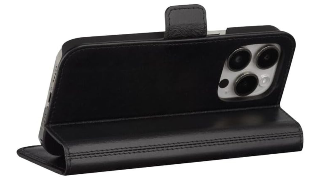 It is manually manufactured in whole leather that develops a beautiful patina with use and has a foldable back for watching horizontal videos with free hands.