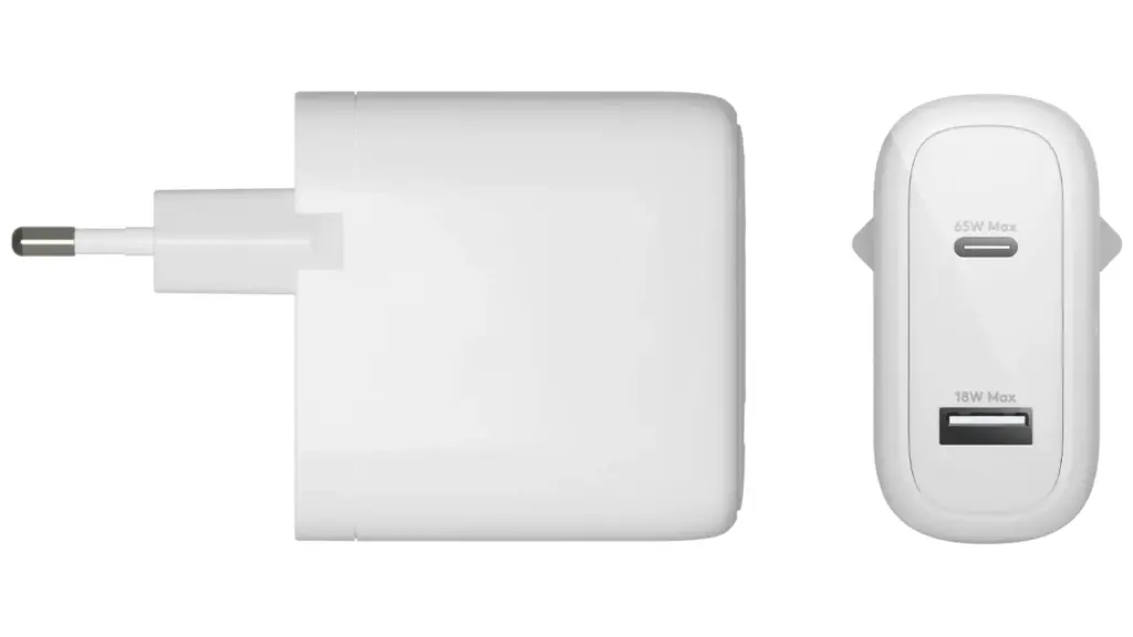 Acest încărcător de perete de 65 wați USB-A + 18W cu conector USB-C oferă încărcare universală rapidă și sigură pentru smartphone-uri, tablete și unele laptopuri.