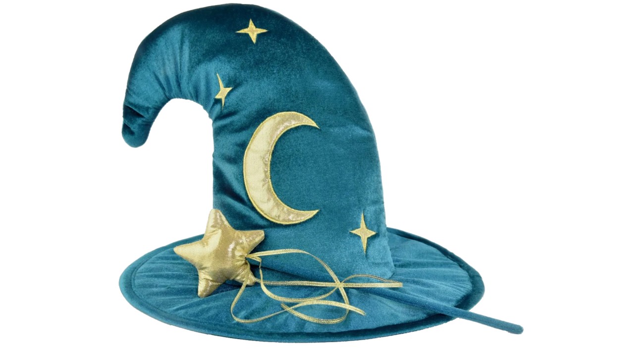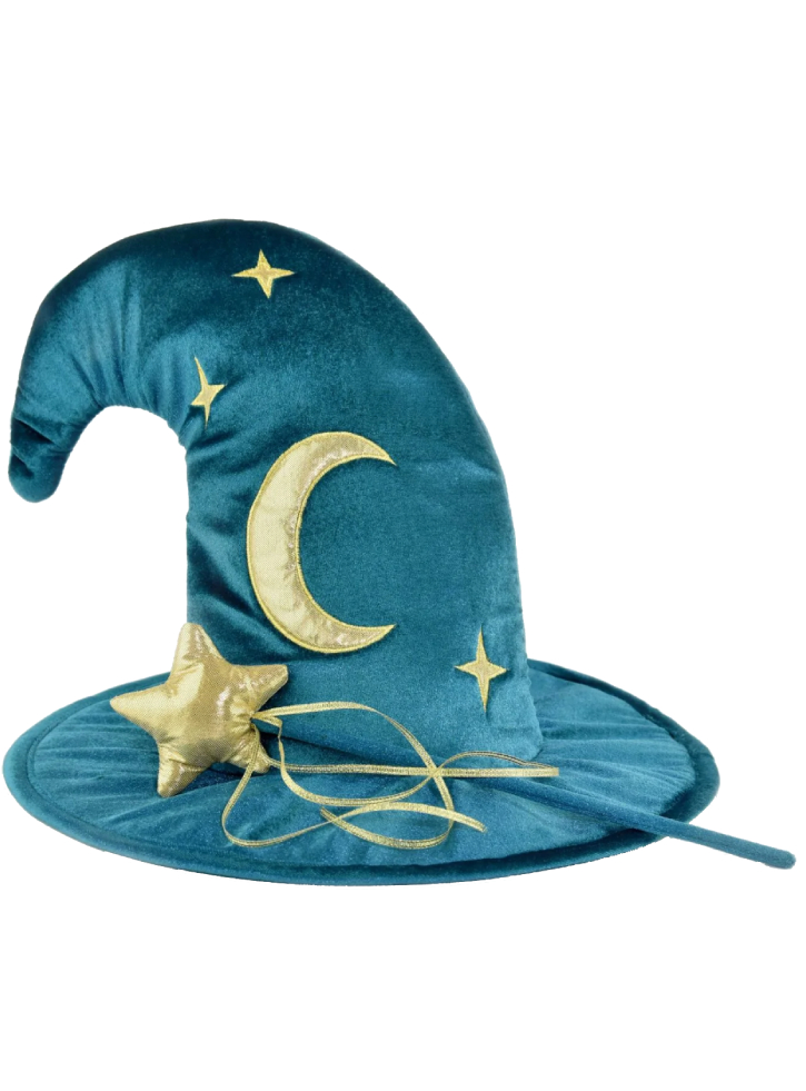 Designul său clasic, cu formă conică și detalii aurii, este perfect pentru orice costum de vrăjitor sau vrăjitoare.