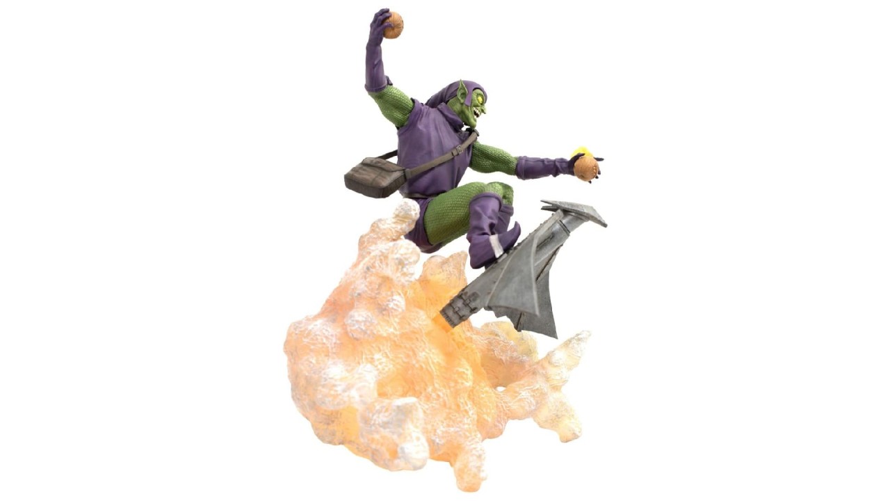 O lansare Diamond Select Toys! Eliberați Goblin-ul! Spiridușul Verde este un super-răufăcător cu tematică de Halloween ale cărui arme seamănă cu lilieci, fantome și lanterne de Halloween.