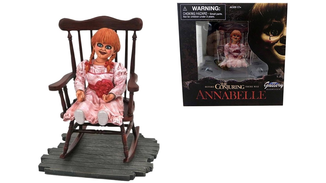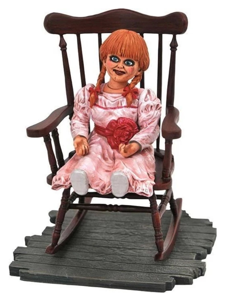 Reprezentând păpușa Annabelle așezată într-un balansoar, această sculptură este detaliată și este pictat manual.