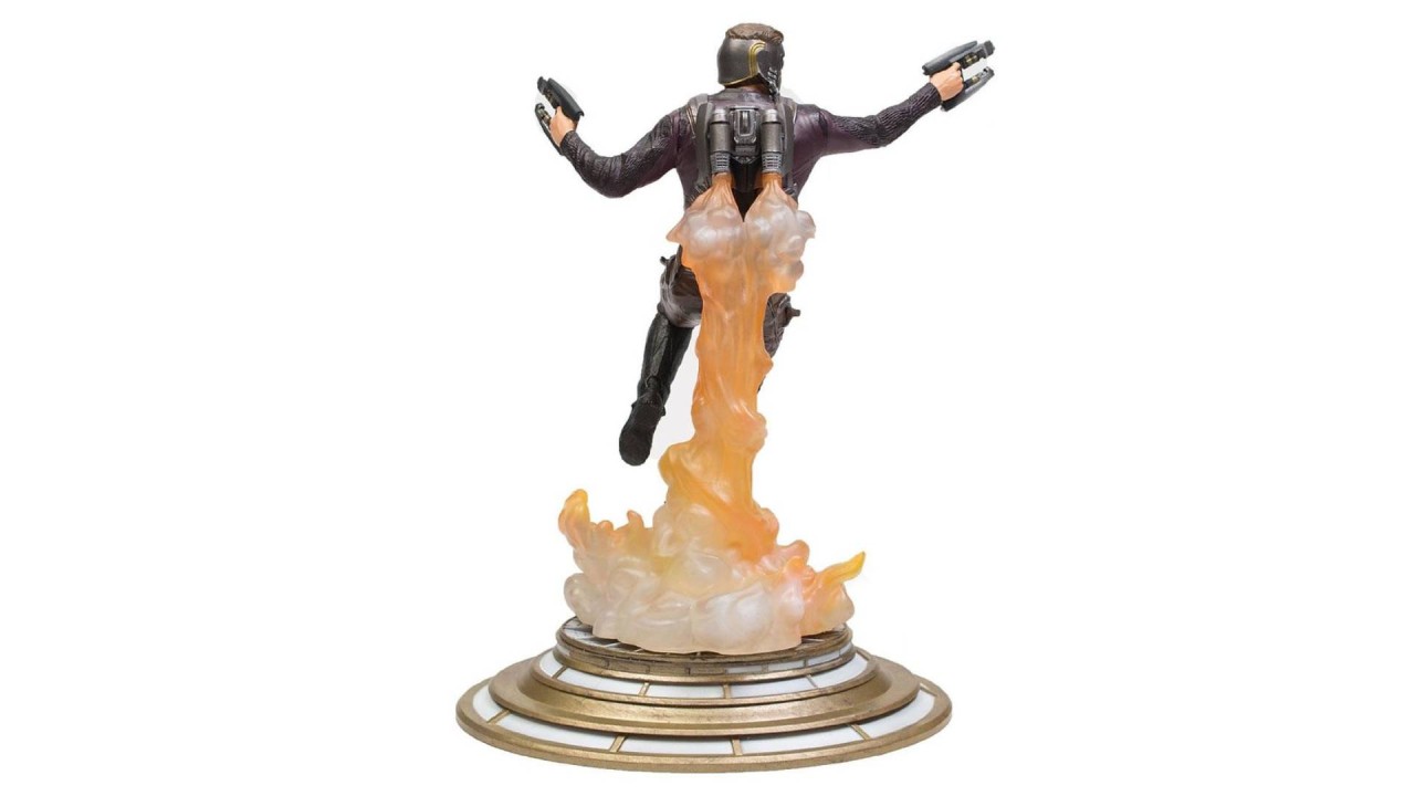 Star-Lord cu jet-pack-ul său se lansează in spațiul cosmic de pe rafturile tale, cu sculptură și aplicații de vopsea foarte detaliate.