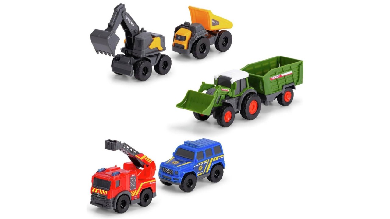 Dickie Toys Set of 5 micromasins of toy, 5 police cars, firefighters, excavator, tractor with a trailer and self -bascular.