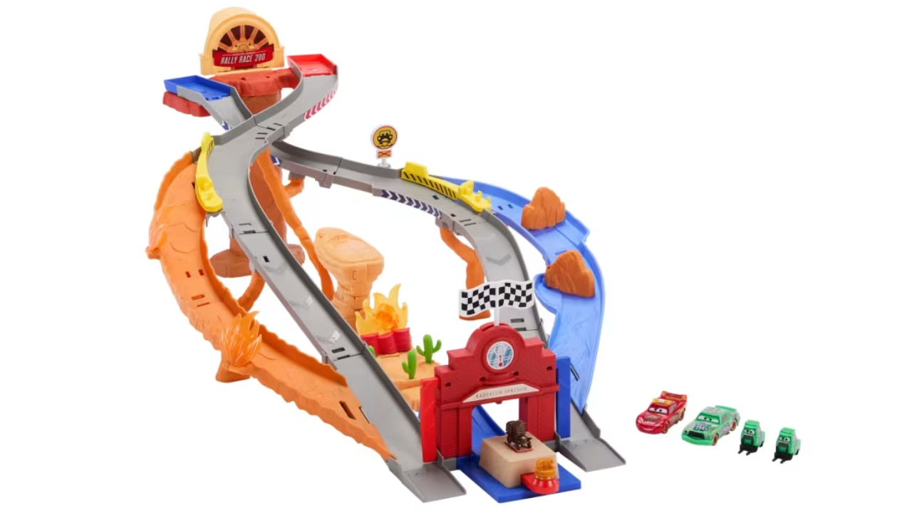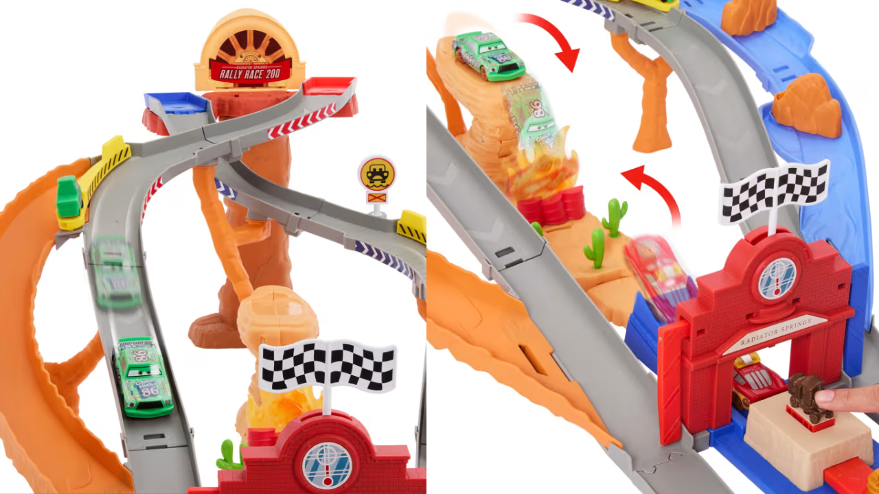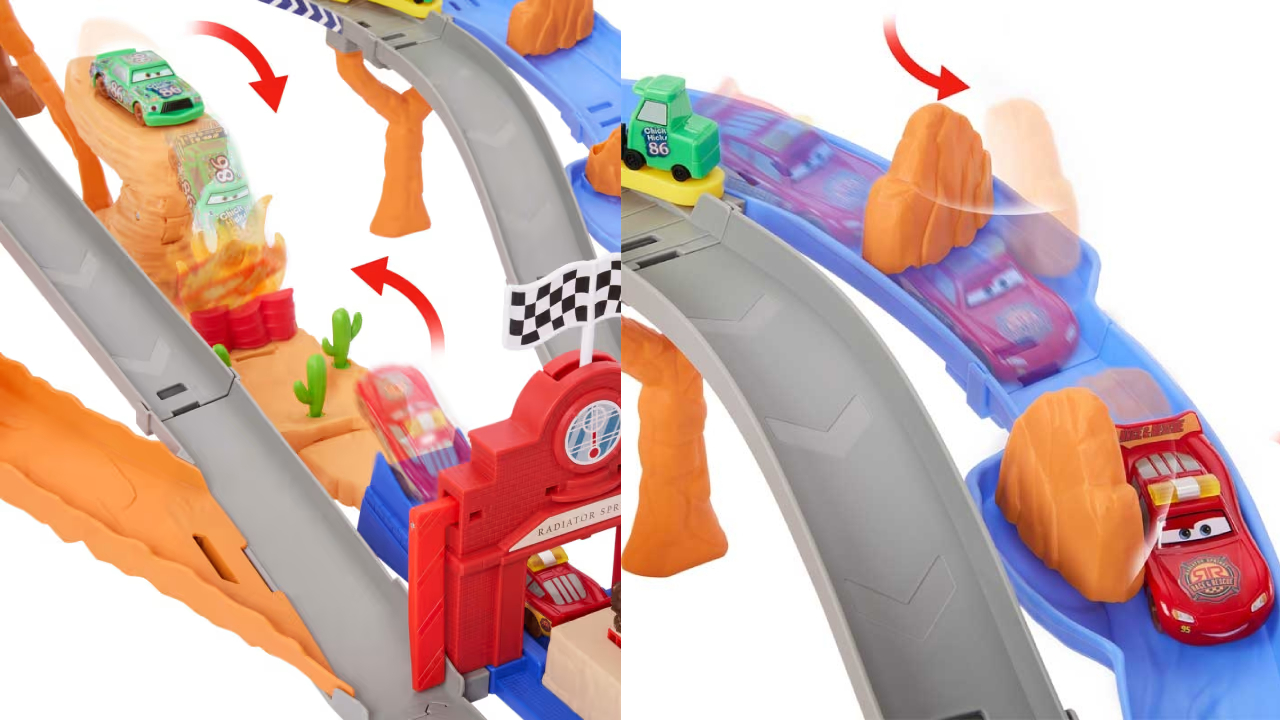 Include patru mașinuțe die-cast cu design autentic: Lightning McQueen, Mater și alți doi prieteni din Radiator Springs. Pista are mai multe zone de acțiune, unde copiii pot recrea curse și misiuni de salvare palpitante.