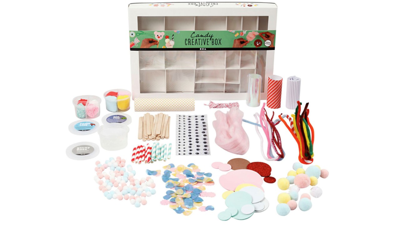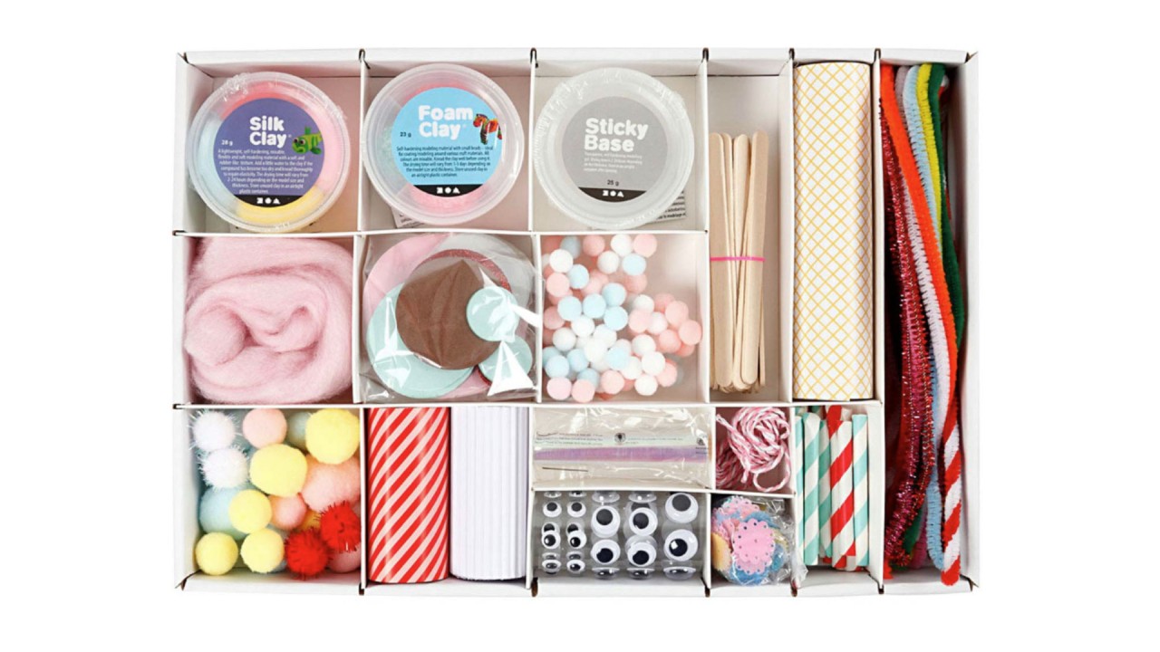 Produsul comntine: argilă de spumă, argilă de mătase, bază adezivă, fire, pompoane, hârtie cu model, carton ondulat, ochi googly autoadezivi, celofan iridescent, cordon de bumbac, cercuri din spumă Eva, paiete, bețe de înghețată, chenille (curățătoare de țevi) și paie mici de hârtie.