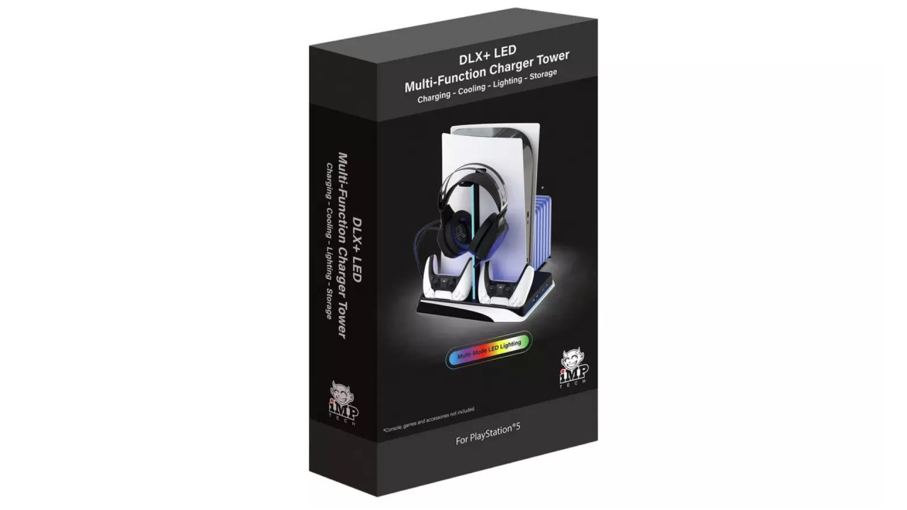 PlayStation 5 DLX+ LED Multi-Function Charger Tower is compatible with both digital console and PS5 Disc console Stylish design, free for PS5 Drop and Charge functionality for 2 DualSense controllers.