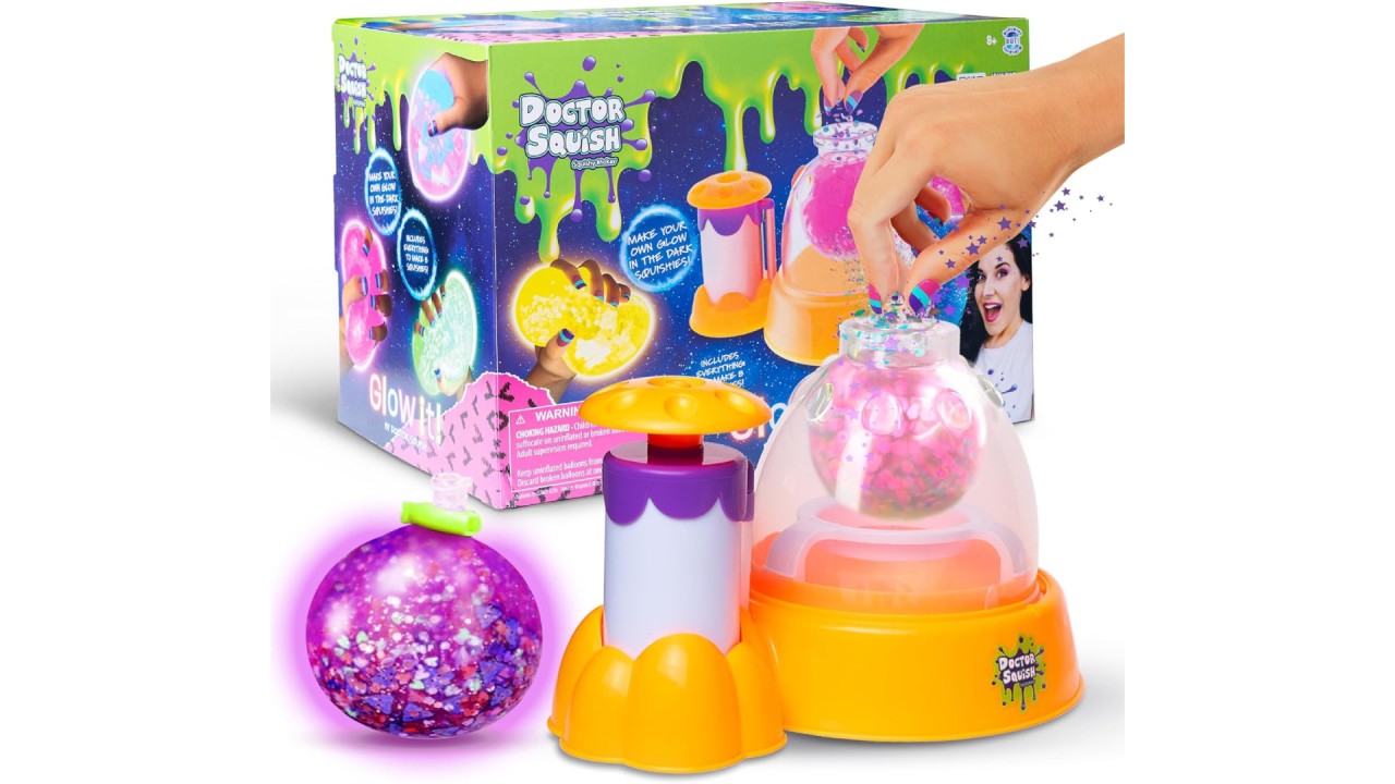 Acest set face parte din seria Doctor Squish și vine cu toate uneltele necesare pentru a fabrica jucării squishy personalizate, într-o versiune neon vibrantă.