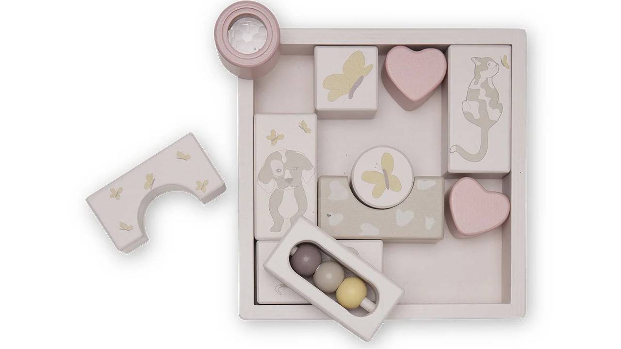 O cutie inteligentă cu tot felul de blocuri senzoriale. Oglindiți, scuturați, rotiți și priviți împreună cu blocurile ilustrate.