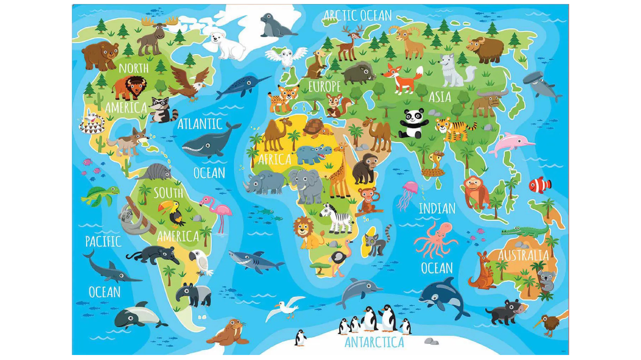Designul vibrant și colorat prezintă o hartă detaliată plină cu diverse ilustrații de animale, făcând din învățarea geografiei o aventură interesantă.