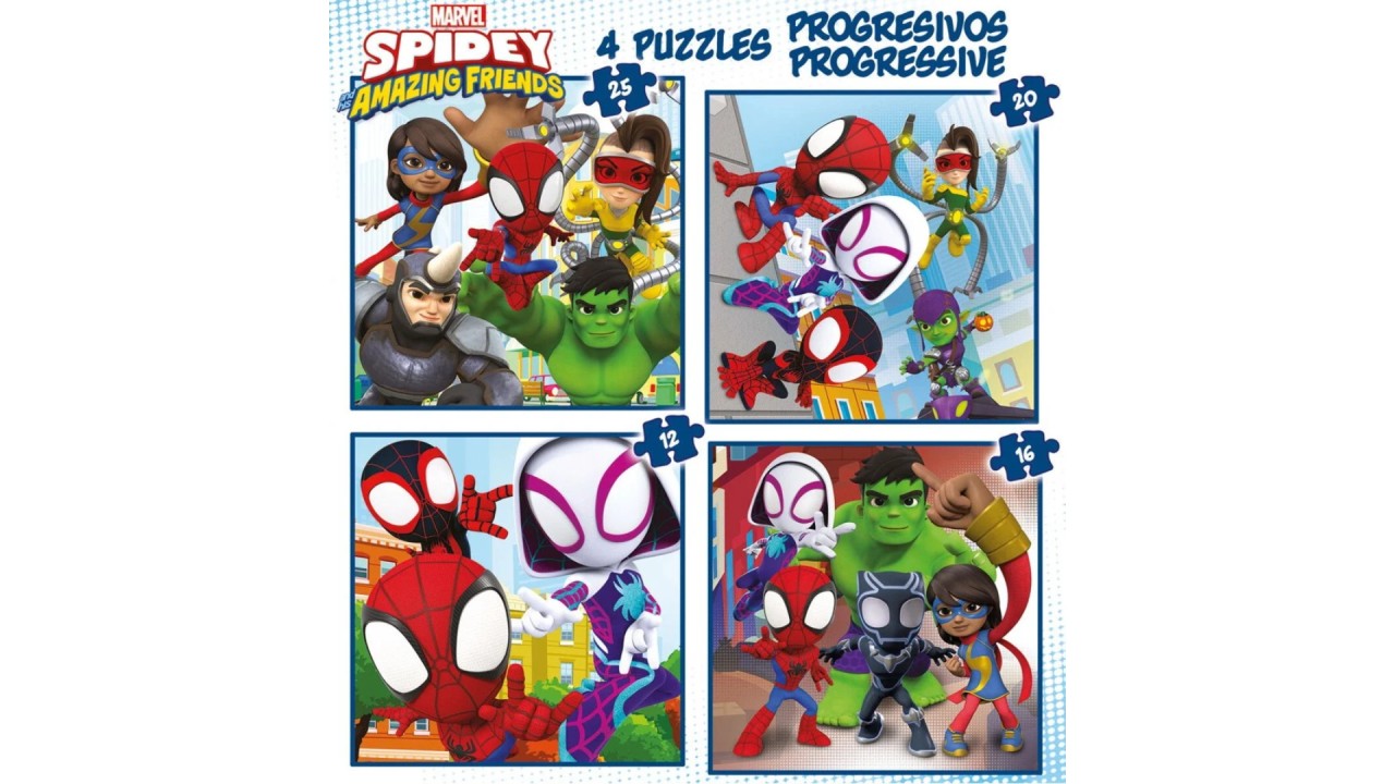 Aceasta cutie contine patru puzzle-uri cu motive cu Spiderman din Spidey Amazing friends.