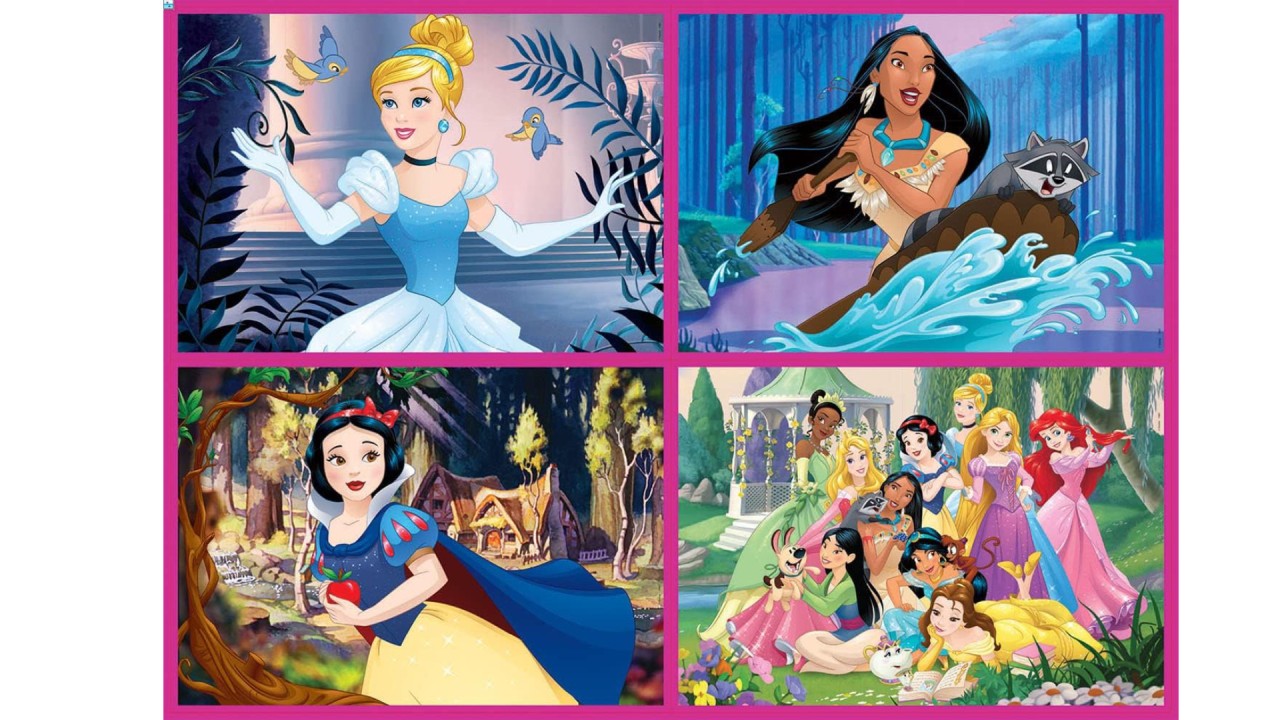 Fiecare puzzle prezintă imagini pline de culoare și magie cu prințesele îndrăgite din poveștile Disney, cum ar fi Cinderella, Belle, Ariel, Rapunzel, Aurora și alte personaje îndrăgite.