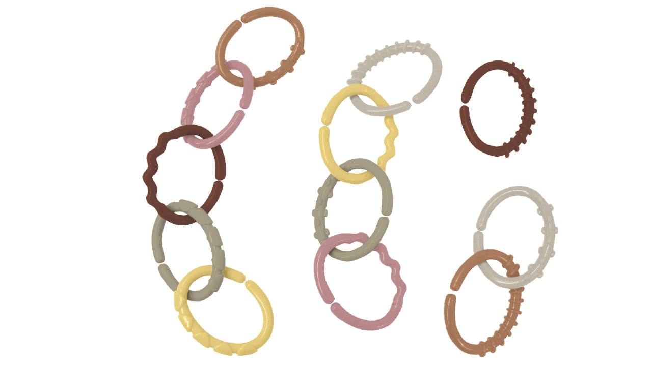 Aceste inele stimulează și dezvoltă simțurile prin texturi striate. Include 12 inele senzoriale în culori boho chic pentru bebeluși.