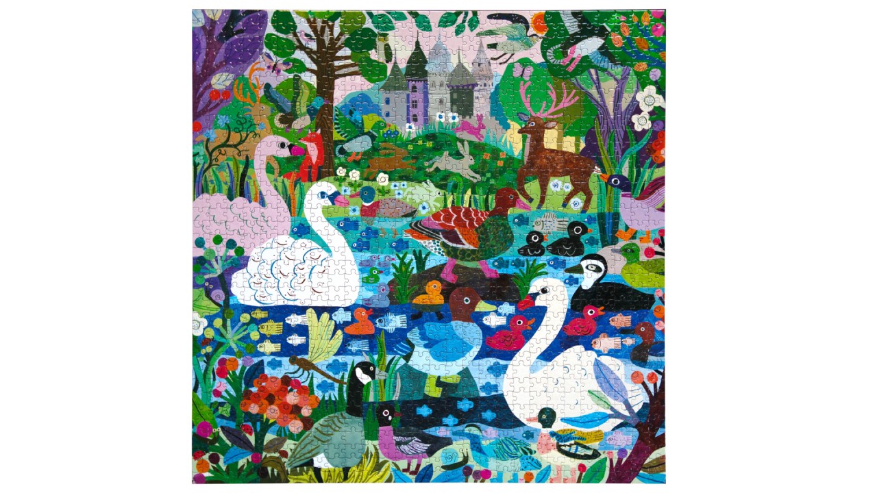 The puzzle shows a flock of ducks, a flock of swans, relaxing on a forest pond.