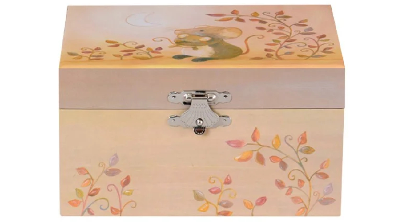 Aceasta cutie muzicala este ompodobită cu un fermecător imprimeu cu șoarece și frunze.