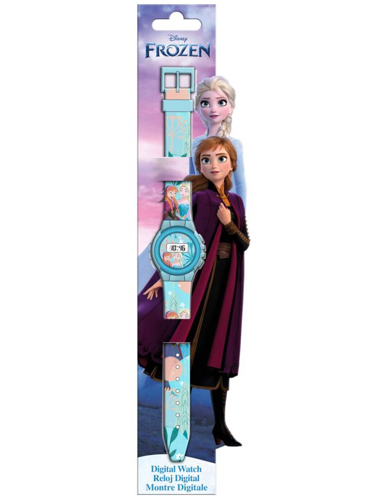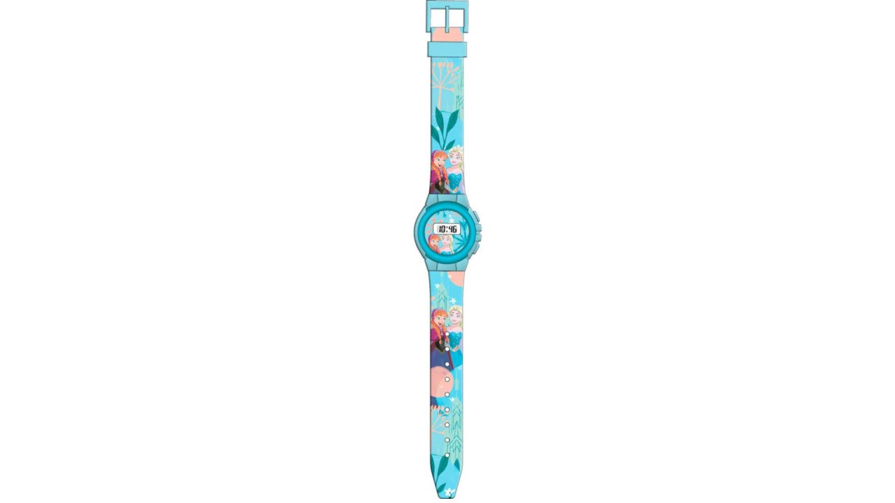 Cureaua din silicon cu imprimeu vibrant și închidere tradițională cu cataramă . Afișaj ușor de citit cu Elsa și Anna pe fundal.