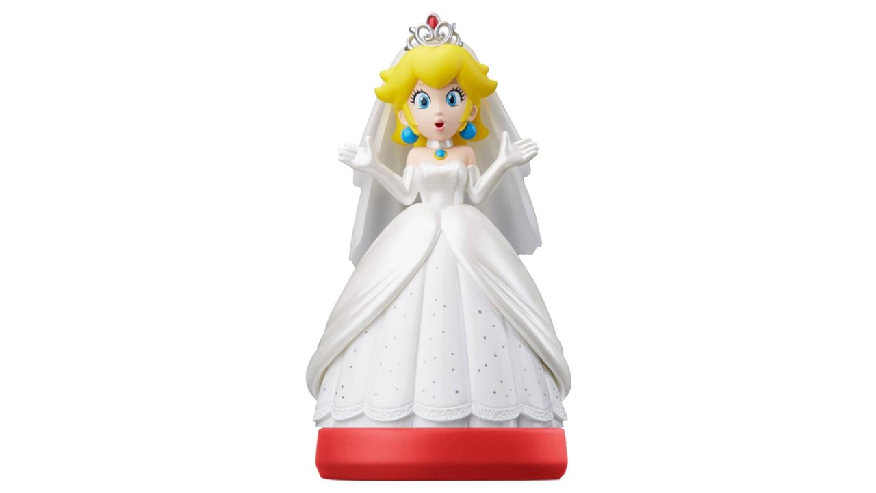 A natural tennis and golf player, a ferocious driver, and more than capable of adventure and combat, this amiibo figure features Princess Peach decked out in her wedding attire from Super Mario Odyssey.