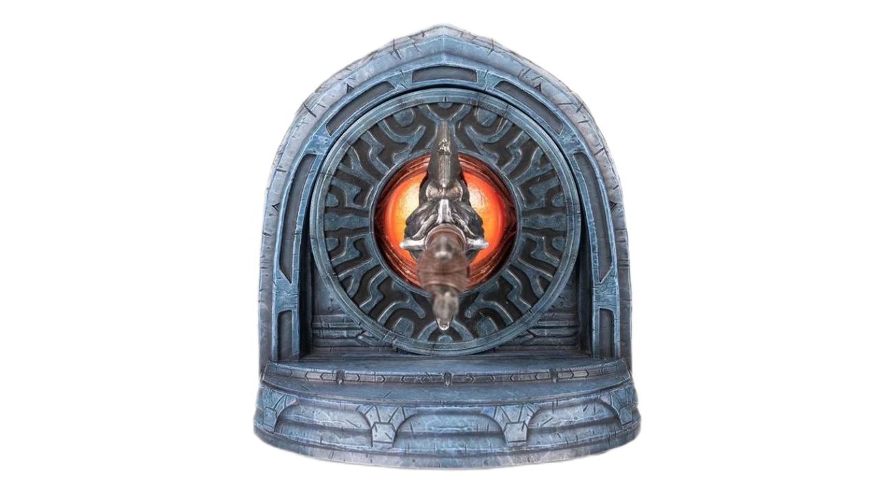 The concept of this bookend statue is inspired by the epic boss battle in Darksiders, where War stabs Straga's vulnerable eye from behind.