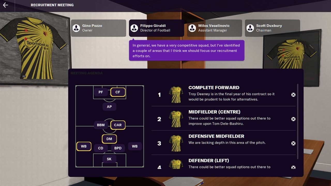 Noile roluri ale personalului, întâlnirile și interacțiunile împrospătează una dintre cele mai populare zone ale jocului. Întâlnirile de recrutare vă asigură acum că dvs. și echipa dvs. de exploratori vă aflați pe aceeași pagină, atât pentru viitoarele dvs. mișcări, cât și pentru strategia pe termen lung a clubului pe piața transferurilor. Mai mult, acum veți putea aborda agenții direct despre interesul unui jucător de a vă alătura clubului, ceea ce imită modul în care se fac tranzacțiile în lumea reală a fotbalului.